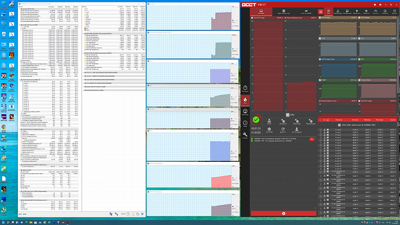Как видим, мощная СВО от Sapphire прекрасно справилась с задачей, нагрев CPU не достигал критических величин, 5,2 ГГц по всем Р-ядрам стабильно держался. Правда Е-ядра почему-то автоматически не стали поднимать частоты (обычно было достаточно поднять частоту на Р-ядрах, оставив режим частот по Е-ядрам на автомате, и вслед за Р-ядрами поднималась частота и на других). Отдельно скажу, что выставление вручную 3,9 ГГц на Е-ядрах не привело к перегреву, температуры все были примерно в тех же пределах. Собственно, мы получили полную картину отменного потенциала системы питания у этой материнской платы.