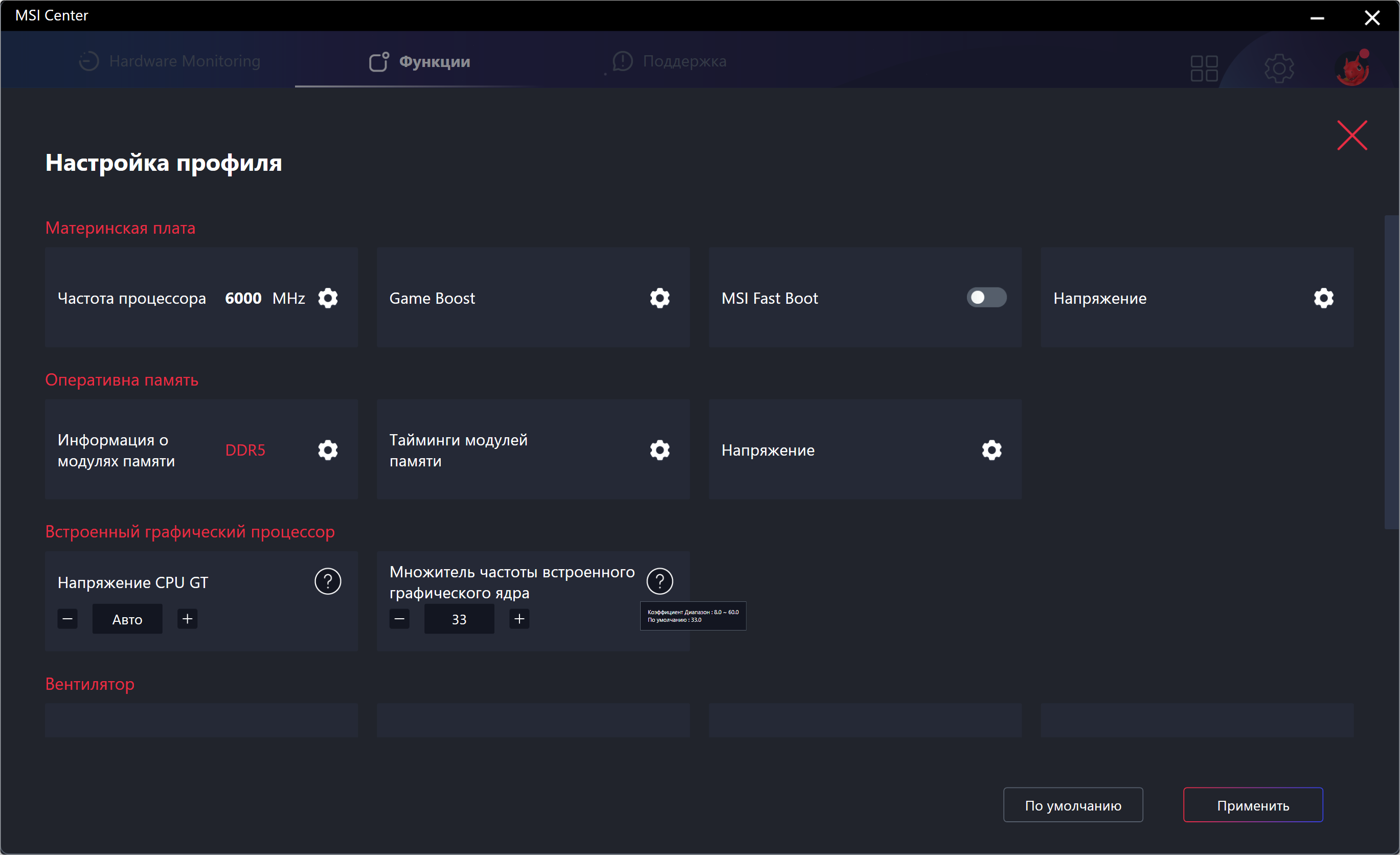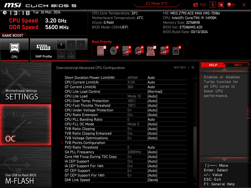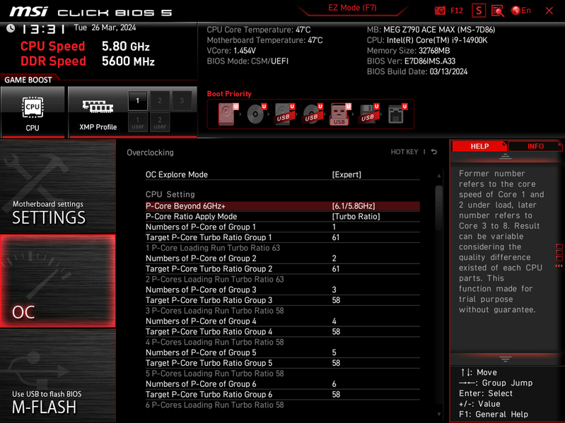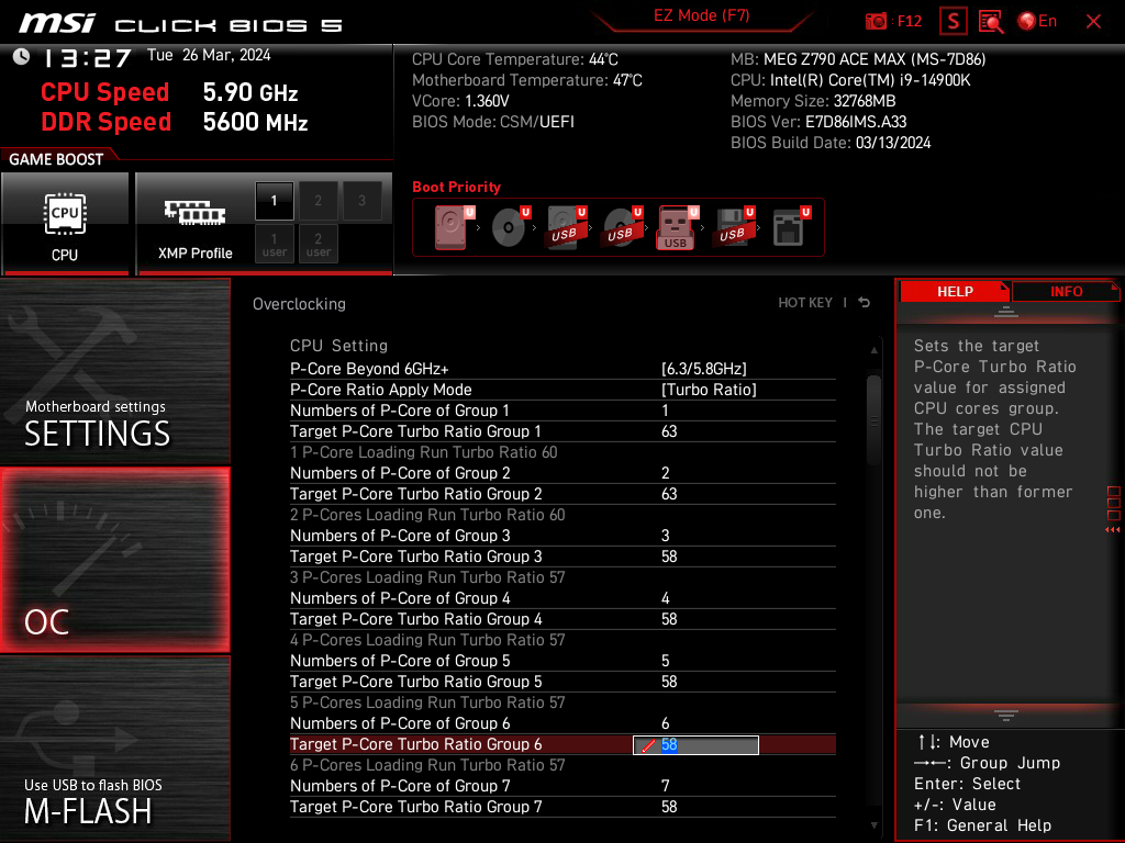 В настройках BIOS данной платы просто море настроек по оверклокингу, чтобы перепробовать хотя бы треть из них – потребуются недели тестов, проб и ошибок -) Поэтому просто мне попалась вот такая опция, где возможна установка 6.3 (!!!) ГГц на некоторых ядрах (это пресет, специалисты MSI сами настроили все опции). Эта настройка не заработала: тестовая программа OCCT даже отказалась запускаться, ну и через минуту – BSOD.