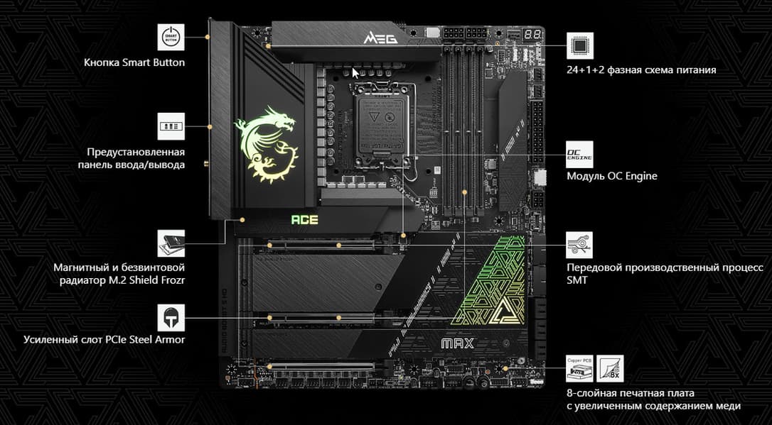Переходим к материнской плате MSI MEG Z790 Ace Max, которая относится к топовому суббренду MEG, поэтому перед нами один из флагманов (уже много лет самая-самая в этой игровой линейке — материнка c суффиксом Godlike).