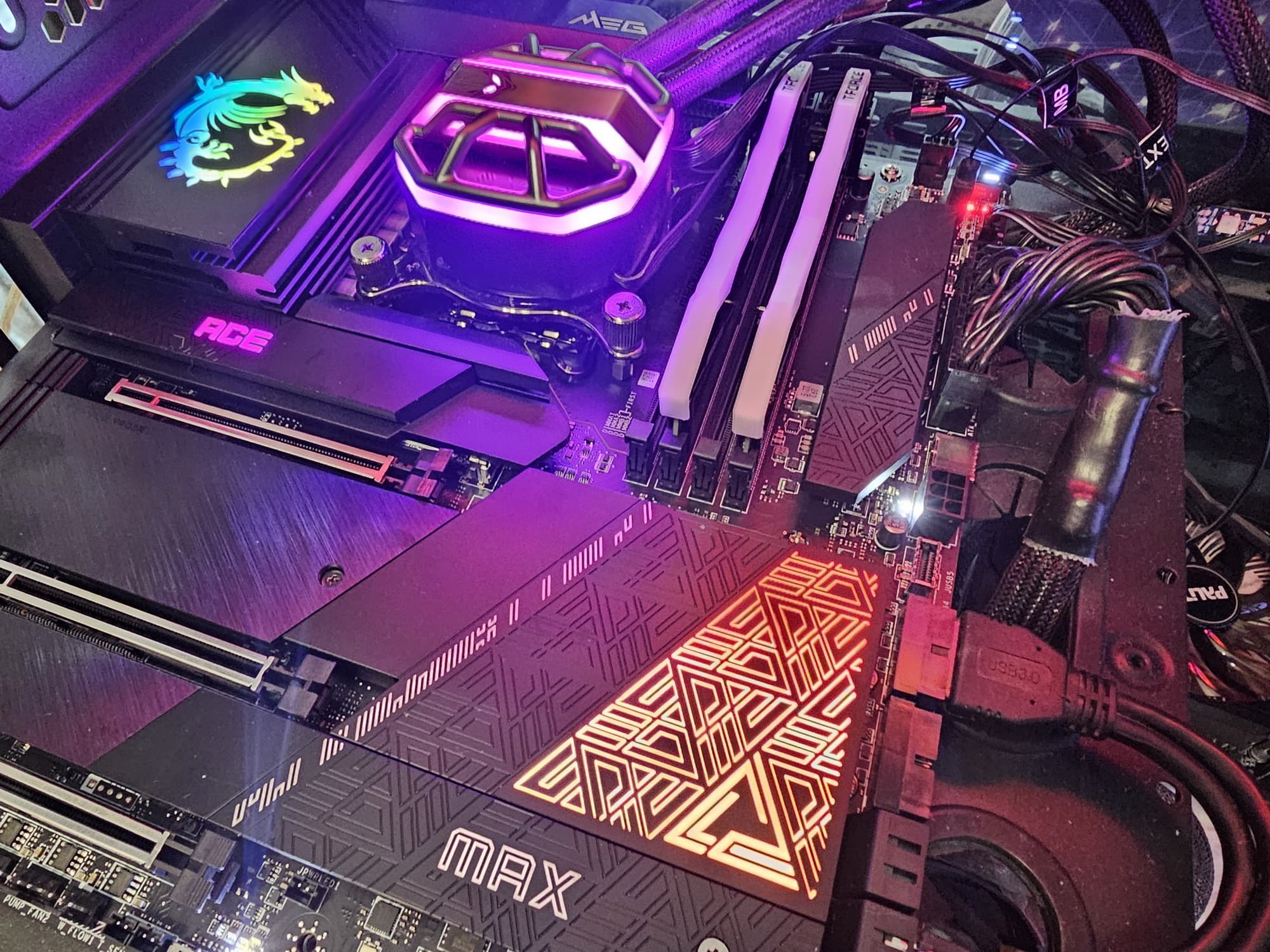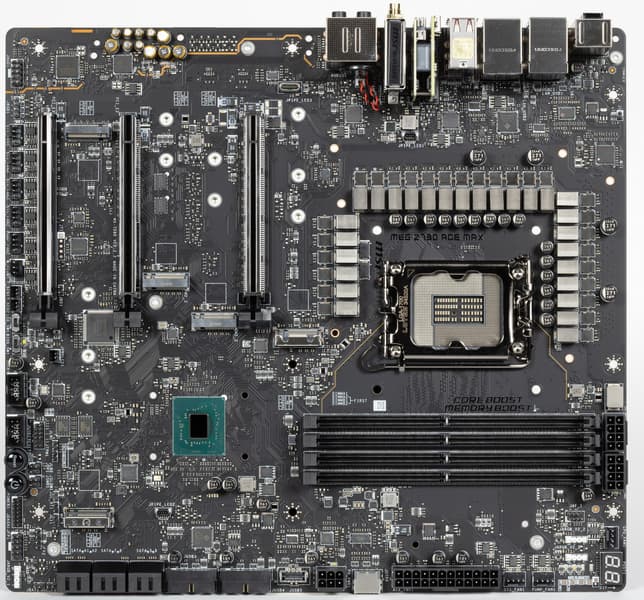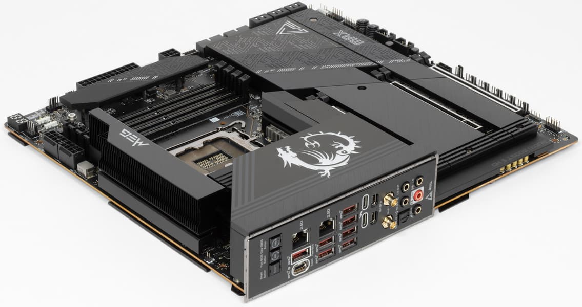 У MSI MEG Z790 Ace Max имеется 20 портов USB разных видов, включая 10 быстрых USB 3.2 Gen2, из которых два поддерживают Thunderbolt 4, а также два очень скоростных USB 3.2 Gen2×2 в виде внутренних Type-C (один из них поддерживает очень быструю зарядку мобильных устройств до 60 Вт, требуется только подключить дополнительное питание). Плата предлагает три слота PCIe х16, два из которых получают от процессора 16 линий PCIe версии 5.0, а третий подключен к Z790 всего 4 линиями PCIe 4.0. Также у платы 5 слотов M.2: два подключены к CPU линиями PCIe 4.0/5.0, три других подключены к чипсету Z790 линиями PCIe 4.0. В арсенале платы также есть 6 портов SATA. Следует учитывать, что ряд слотов и портов делят ресурсы, то есть не все 5 слотов M.2 можно заполнять модулями, одновременно подключив 6 SATA-устройств или заняв второй слот PCIe x16. Однако вариантов много, подобрать подходящий сможет практически каждый.