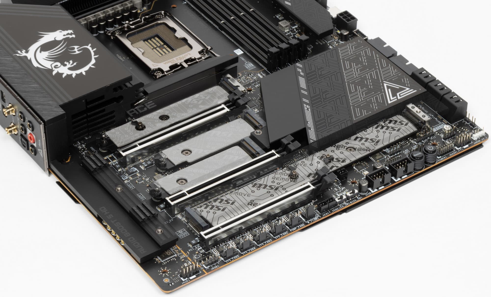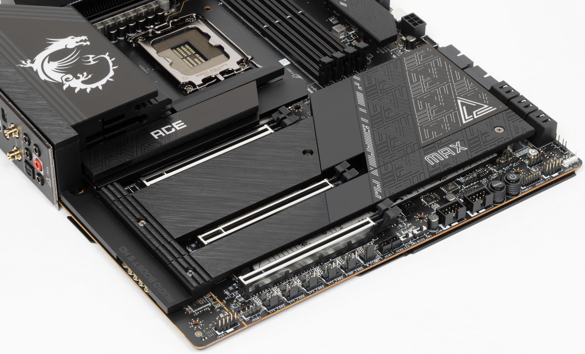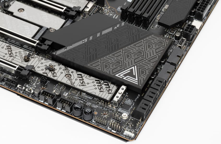 Не забываем, что нижний левый слот M.2_4 умеет работать с накопителями с интерфейсом PCIe версии 5.0. Зная, что такие устройства сегодня очень сильно нагреваются, потому и поставляются со своими массивными радиаторами охлаждения, очень странно выглядит желание инженеров MSI накрыть этот слот и соседний M.2_5 единым радиатором (скорее всего последний придется снять вообще при использовании модуля M.2 PCIe 5.0).