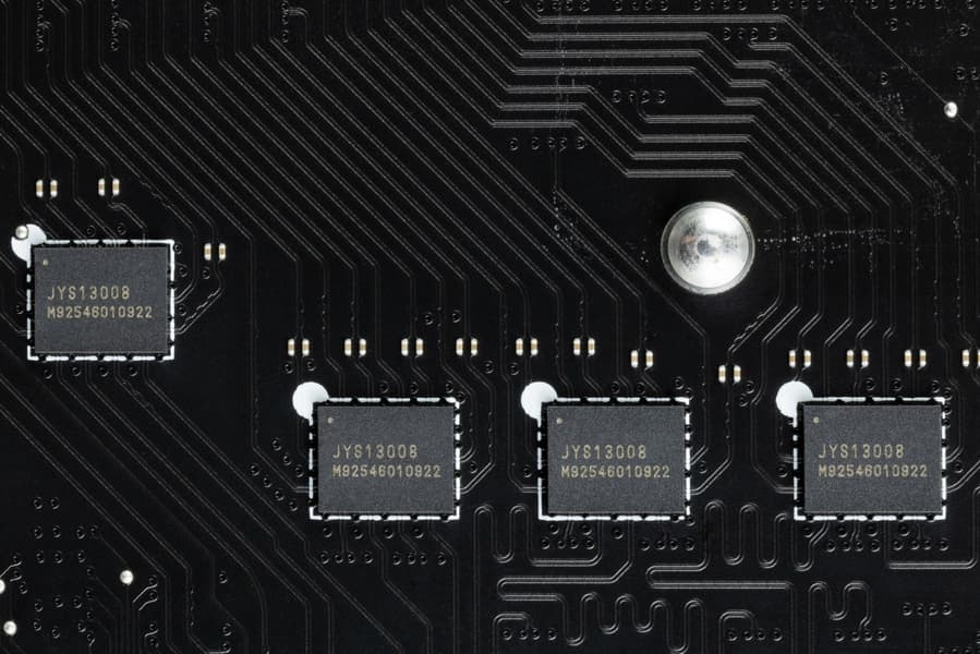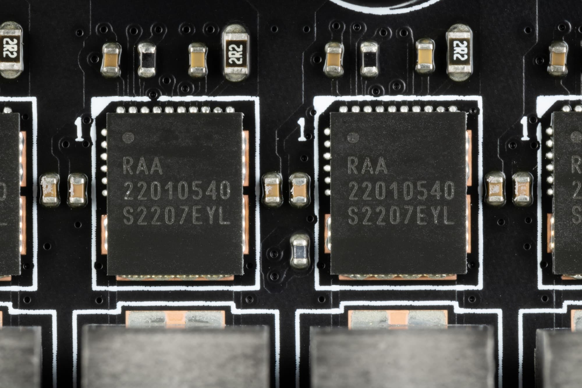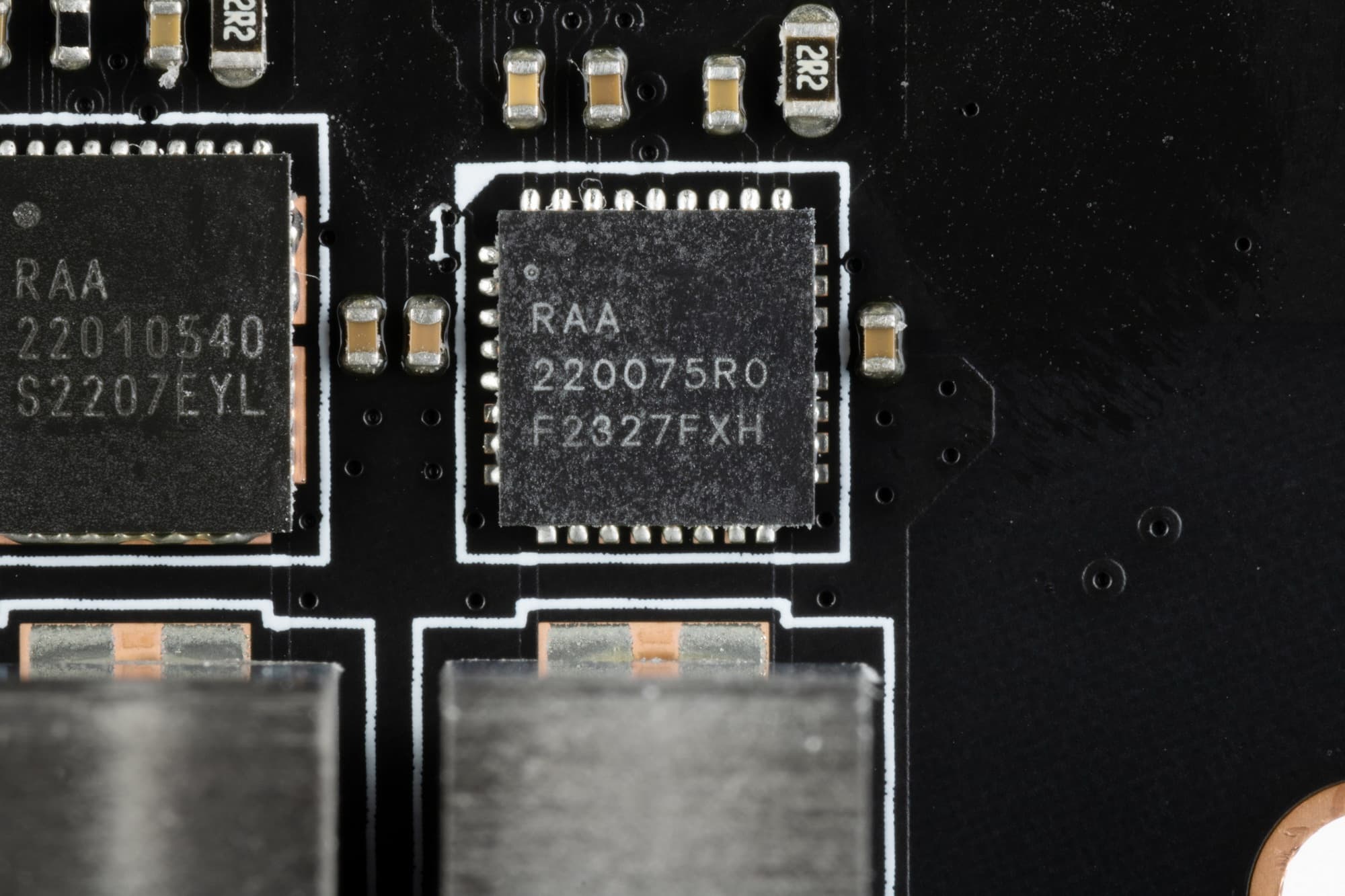 Каждый канал фазы VCore имеет суперферритовый дроссель и RAA 22010540 MOSFET от Renesas) на 105 А.