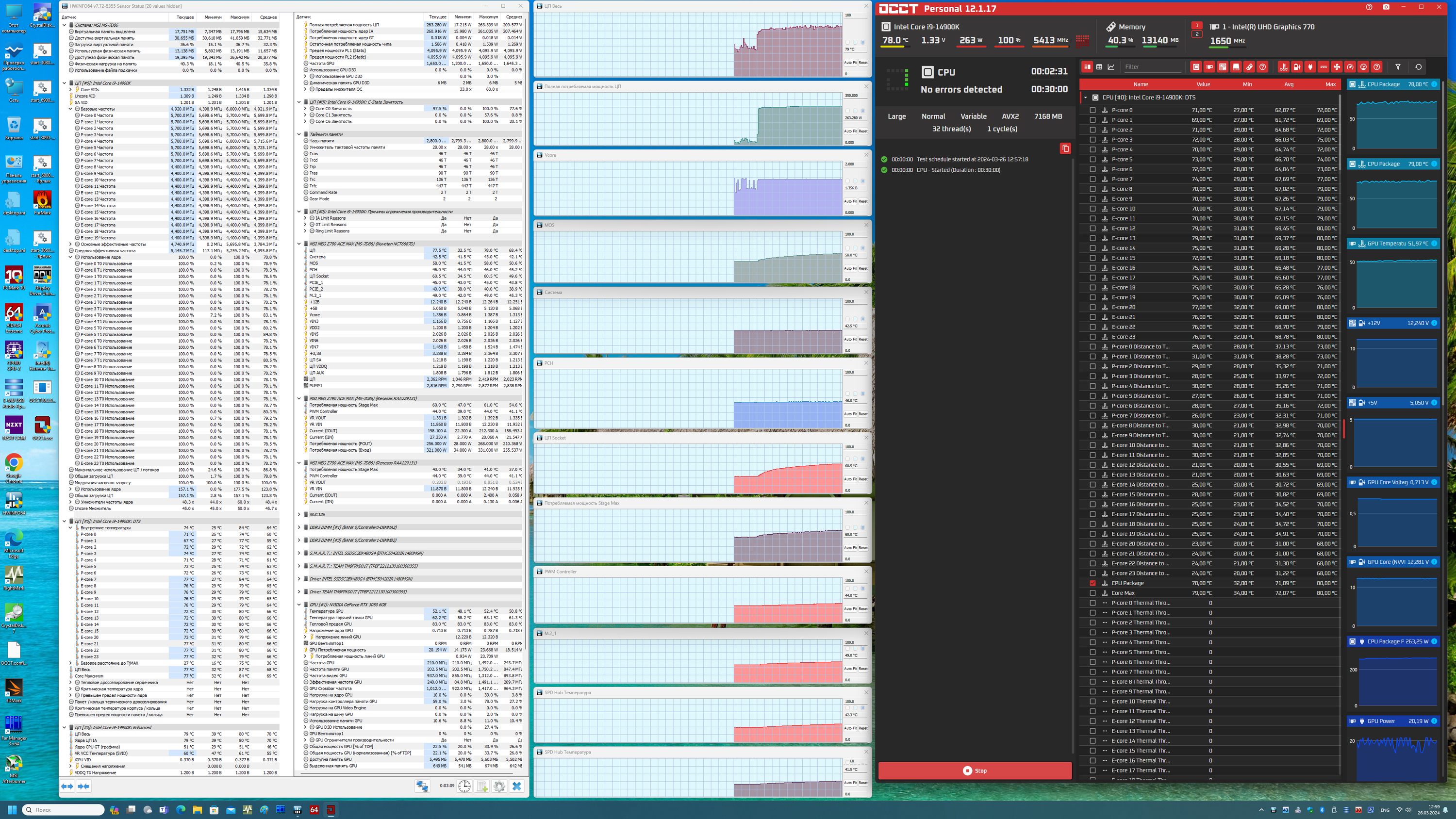 Да, это по сути стандартный уже авторазгон Core i9 14900K для материнских плат топового уровня на чипсете Z790. Именно плат с очень мощным питанием. Все остальные параметры системы по нагреву компонентов были в норме. И стоит отметить, что потребление CPU превысило 260 Вт.