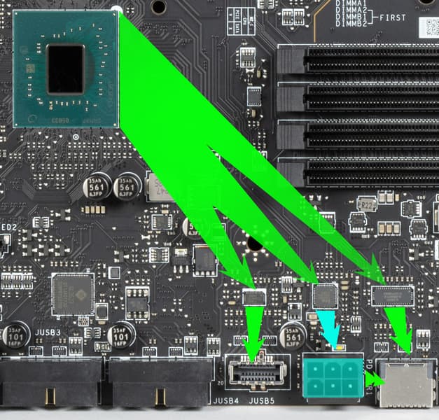 Следует особо отметить, что для получения очень быстрой зарядки 60 Вт на порту USB 3.2 Gen2x2 следует обязательно подключить питание к 6-контактному разъему PCIe около внутренних портов Type-C. Управляет этим контроллер от Realtek.