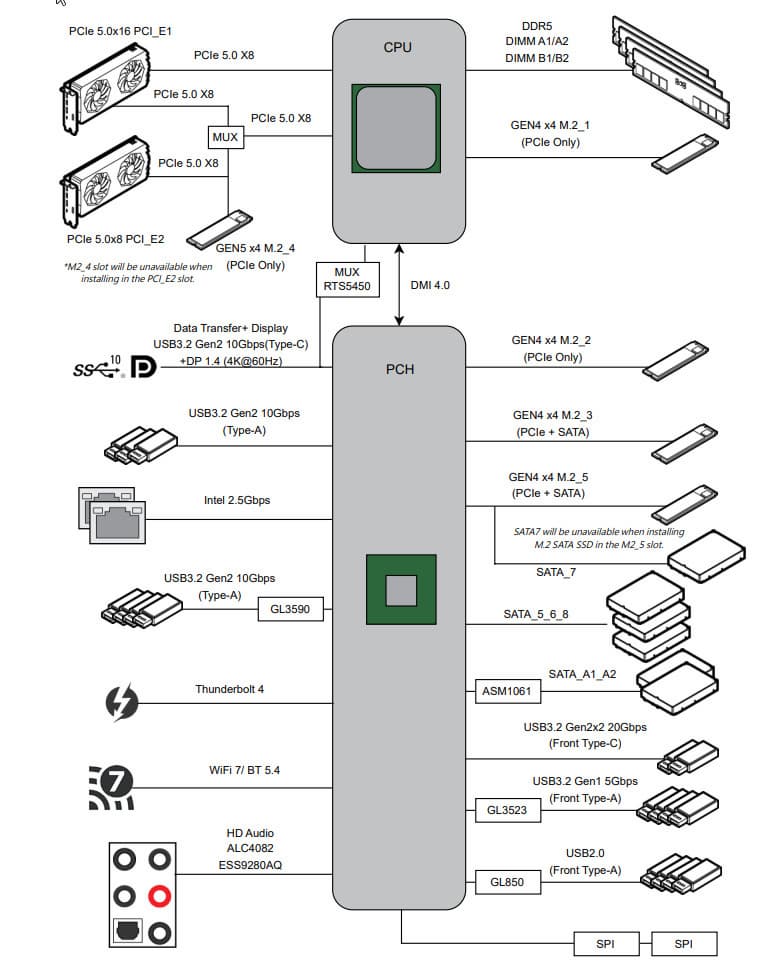 Второй, третий, пятый слоты M.2 (M.2_2, M.2_3, M.2_5) получают данные от чипсета Z790, а M.2_1 и M.2_4 — от CPU (M.2_1 – PCIe 4.0, M.2_4 – PCIe 5.0).