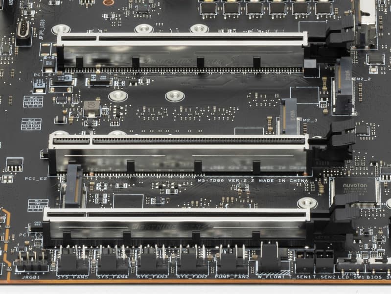 Всего на плате есть 3 слота: два PCIe x16 (для видеокарт или других устройств), они подключены к CPU и третий слот PCIe x16, но который поддерживает только 4 линии PCIe 4.0, он подключен к Z790.
