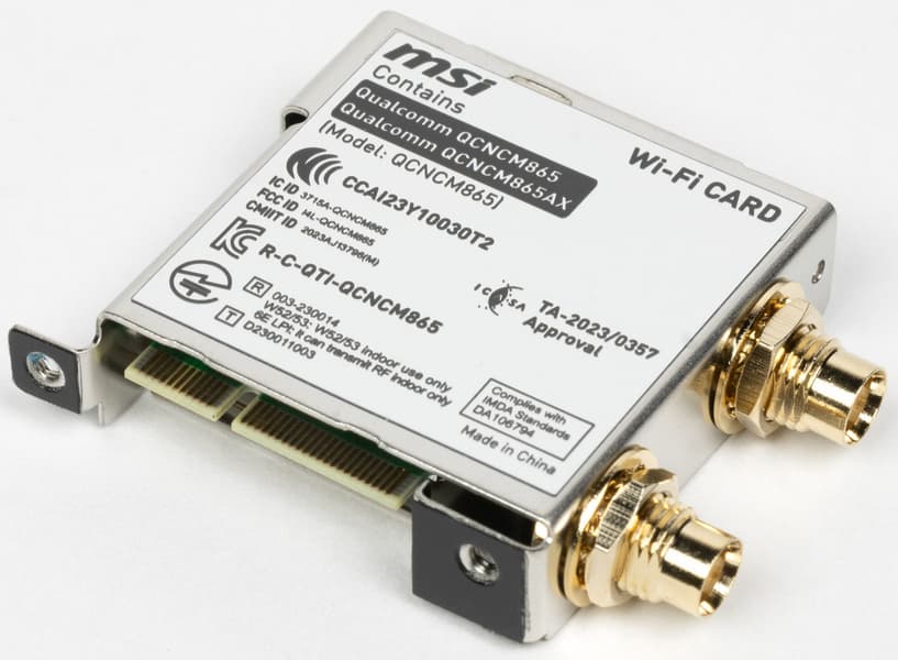 Имеется и комплексный беспроводной адаптер на контроллере Qualcomm QCNCM865, через который реализованы Wi-Fi 7 (802.11a/b/g/n/ac/ax/be, 2,4/5/6 ГГц) и Bluetooth 5.4. Он установлен в слот M.2 (E-key), и его разъемы для привинчивания выносных антенн выведены на заднюю панель.