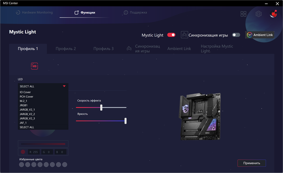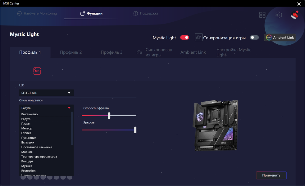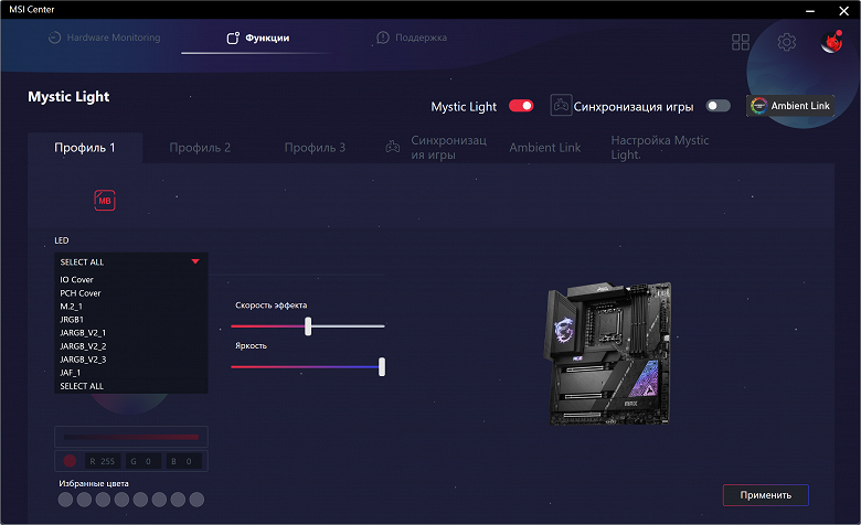 Также плата имеет 10 разъемов для вентиляторов. Система питания процессора очень мощная, она способна обеспечить работу любых совместимых процессоров с очень хорошим запасом на разгон. Плата имеет грамотную систему охлаждения каждого потенциально греющегося элемента, включая накопители в слотах M.2 (термопрокладки для охлаждения накопителей есть с обеих сторон). Сетевые возможности включают два проводных контроллера 2,5 Гбит/с и беспроводной Wi-Fi 7 + Bluetooth 5.4. Поддержка Thunderbolt 4 позволяет передавать данные на скорости 40 Гбит/с. В числе плюсов платы можно упомянуть очень красивую и стильную подсветку, включая широкие возможности для подключения дополнительных RGB-устройств. Отметим и улучшенный аудиокодек Realtek ALC4082. Еще стоит отметить возможность вывода встроенной в процессор графики через интерфейс Type-C.