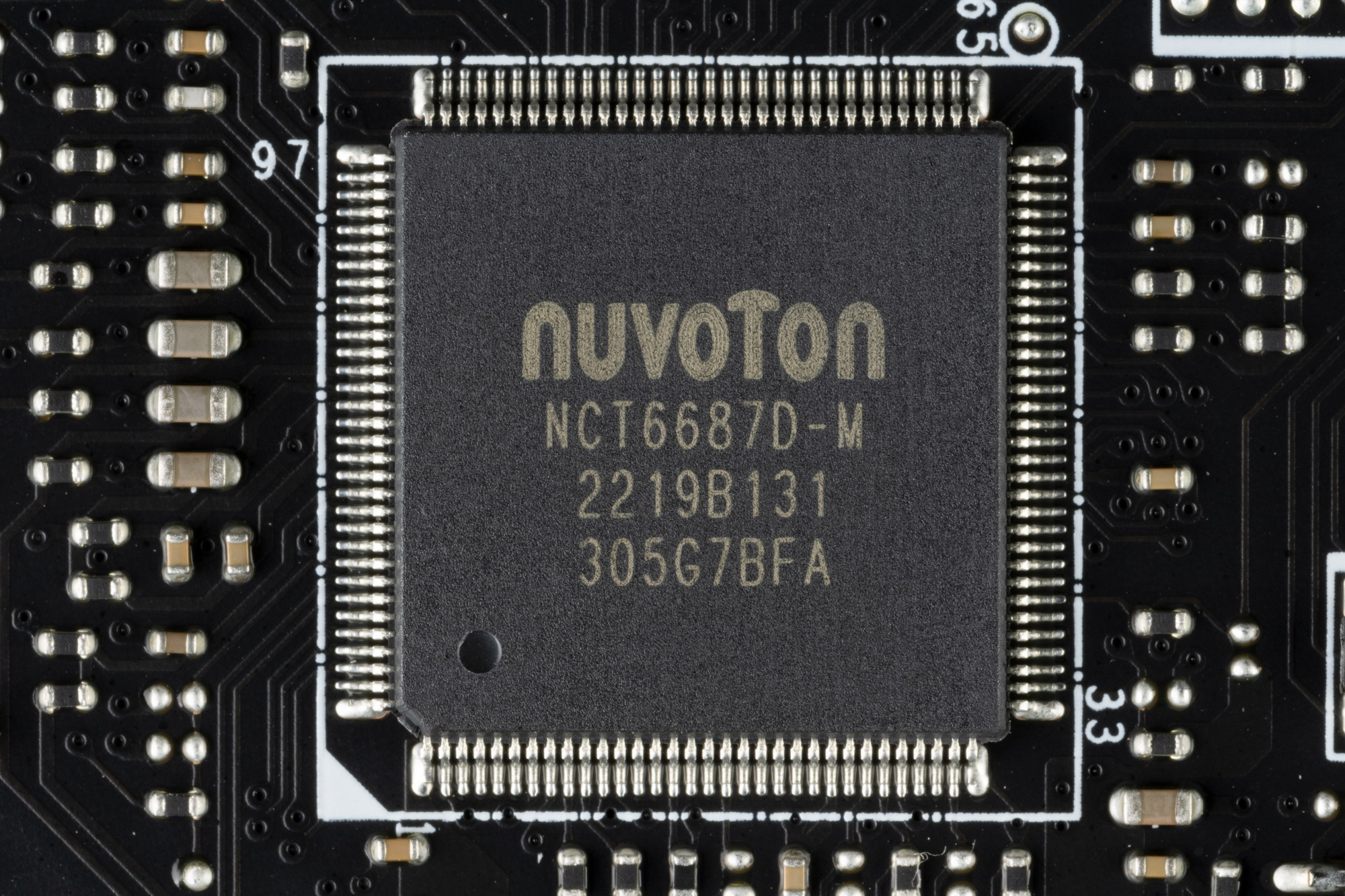 На оборотной стороне расположено несколько контроллеров и традиционная некоторая логика. Текстолит обработан хорошо: во всех точках пайки не только острые концы срезаны, но и все неплохо отшлифовано. На задней стороне установлена пластина из алюминия с наноуглеродным покрытием. Она помогает отводить тепло от задней стороны PCB через термоинтерфейс и обеспечивает жесткость материнской платы.