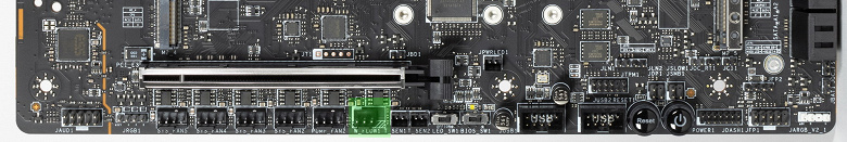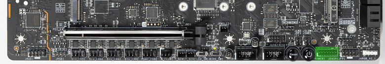 Для питания платы на ней предусмотрены 4 разъема: в дополнение к 24-контактному ATX (он на правой стороне платы (на фото — слева) здесь есть еще два 8-контактных EPS12V и один 6-контактный PCIe (для поддержки питания USB 3.2 Gen2x2 порта, через который могут заряжаться мобильные устройства в режиме быстрой зарядки (до 60 Вт).