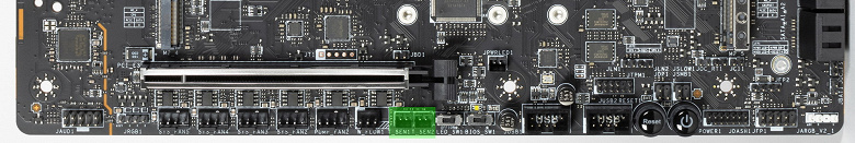 Также плата оснащена Intel Thunderbolt 4 и комплектуется соответствующим контроллером на основе Intel JHL8540, который выполнен в виде отдельного модуля, вставляемого в специальный слот PCIe x4 4.0, расположенный в зоне задних портов ввода/вывода.