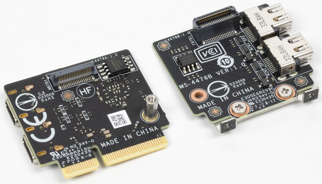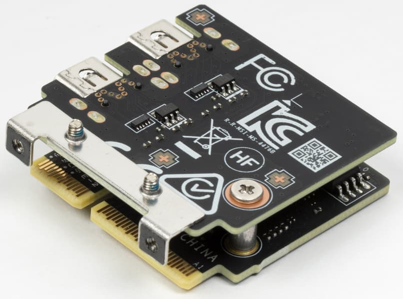 Модуль имеет 2 гнезда Type-C для вывода как через протокол TB, так и для использования в качестве USB 3.2 Gen2/1. Также модуль снабжен двумя гнездами DisplayPort (в форме mini-DP) для приема сигналов от внешних источников (видеокарты и др.), в комплект поставки входят адаптеры-переходники с полноформатных DP на мини-формат.
