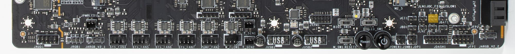 Также плата имеет 10 разъемов для вентиляторов. Система питания процессора очень мощная, она способна обеспечить работу любых совместимых процессоров с очень хорошим запасом на разгон. Плата имеет грамотную систему охлаждения каждого потенциально греющегося элемента, включая накопители в слотах M.2 (термопрокладки для охлаждения накопителей есть с обеих сторон). Сетевые возможности включают проводные контроллеры 2,5 и 10 Гбит/с и беспроводной Wi-Fi 6E + Bluetooth 5.2. Поддержка Thunderbolt 4 позволяет передавать данные на скорости 40 Гбит/с. В числе плюсов платы можно упомянуть очень красивую и стильную подсветку, включая широкие возможности для подключения дополнительных RGB-устройств. Отметим и улучшенный аудиокодек Realtek ALC4082.
