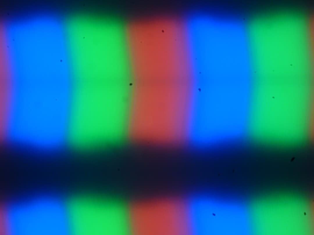 В этом моноблоке используется матрица типа IPS. Из-за матовой поверхности экрана на микрофотографиях структура субпикселей практически не различается, но типичная для IPS форма угадывается (черные точки — это пыль на матрице фотоаппарата):
