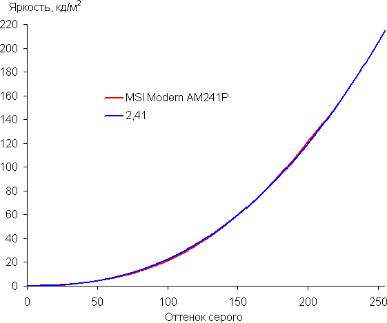 Аппроксимация полученной гамма-кривой дала показатель 2,41, что выше стандартного значения 2,2, поэтому изображение немного затемнено. При этом реальная гамма-кривая мало отклоняется от аппроксимирующей степенной функции: