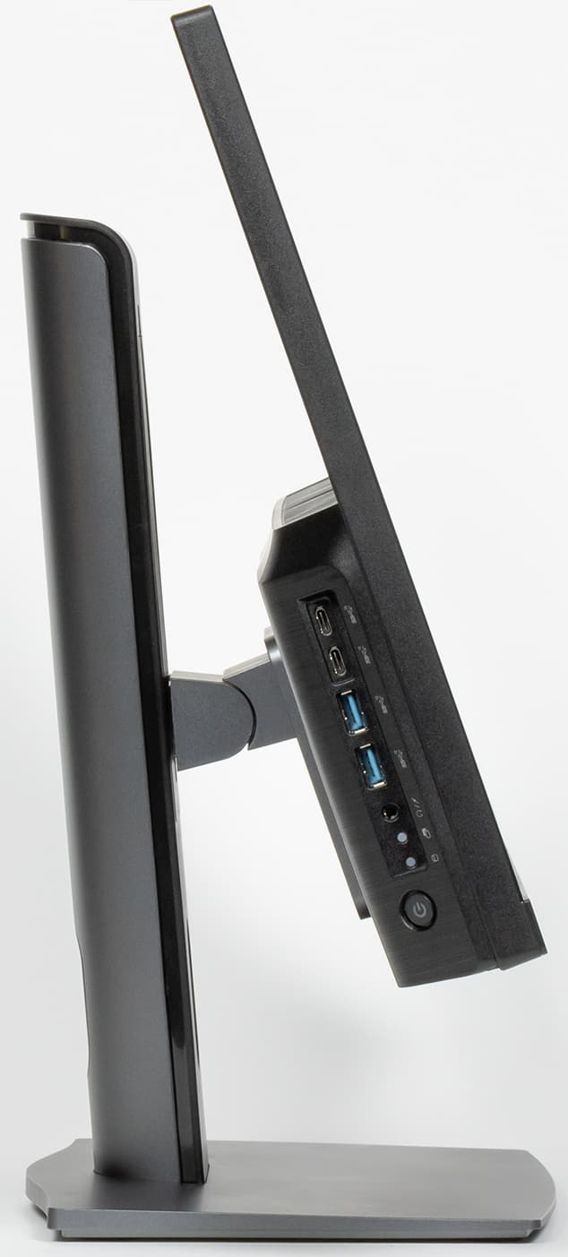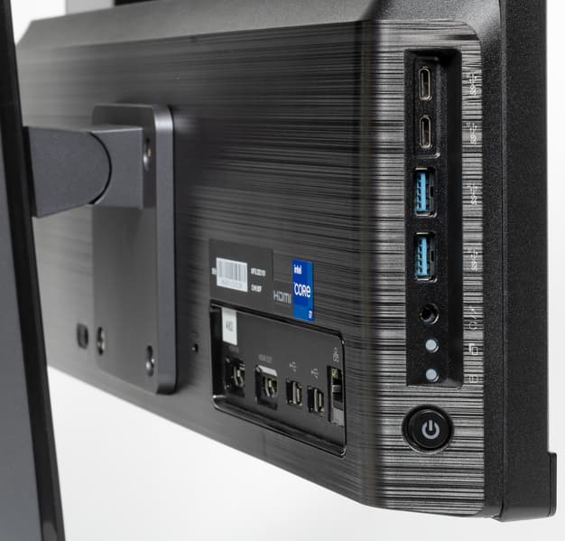 Внешность же основного блока, как уже было сказано, в общих чертах не изменилась. Собственно, сам «компьютер» можно увидеть разве что в профиль: он представляет собой утолщение в нижних 40% «монитора». В деталях здесь есть некоторые улучшения. В частности, на левом торце теперь не два порта USB3 Gen1, а четыре USB3 Gen2, причем два из них имеют исполнение Type-C. На наш взгляд, это слишком радикальный шаг: схема 3+1 пока, скорее всего, была бы немного более удобной. Но тут сказалось ограничение свободного места — и без того пришлось отдельные разъемы для наушников и микрофона заменить одним комбинированным гарнитурным.