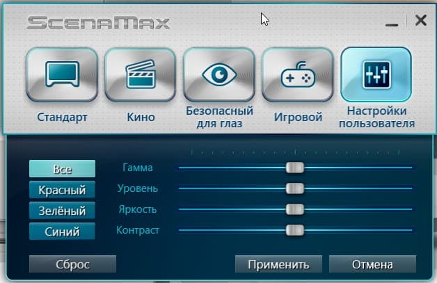 В фирменной утилите ScenaMax можно изменить ряд настроек экрана: выбрать профиль цветокоррекции и вручную подстроить цветовой и яркостный баланс. Выбор профиля Безопасный для глаз снижает интенсивность синей компоненты (впрочем, в Windows 10 есть аналогичная настройка). Почему такая коррекция может быть полезной, рассказано в статье про iPad Pro 9,7″. В любом случае, при работе за моноблоком на ночь глядя лучше снизить яркость экрана до низкого, но еще комфортного уровня. Желтить картинку нет никакого смысла.