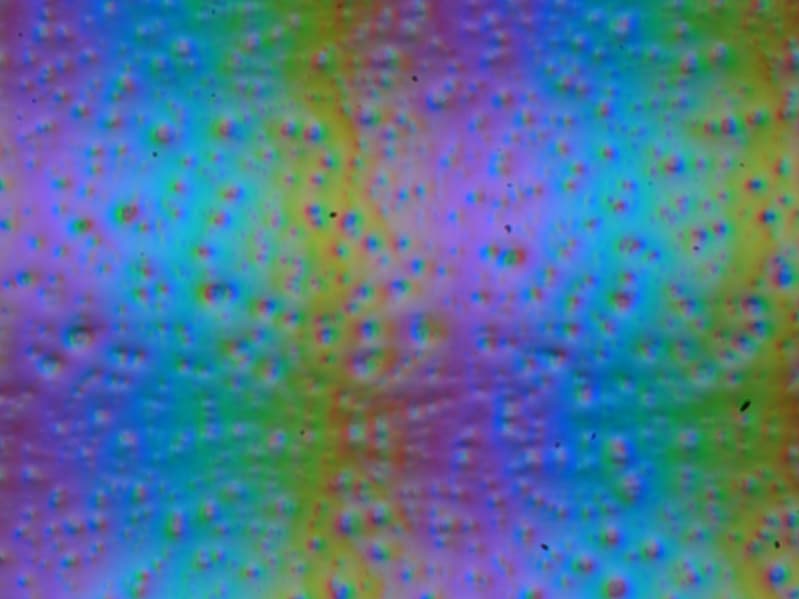 Зерно этих дефектов в несколько раз меньше размеров субпикселей (масштаб этих двух фотографий примерно одинаковый), поэтому фокусировка на микродефектах и «перескок» фокуса по субпикселям при изменении угла зрения выражены слабо, из-за этого нет и «кристаллического» эффекта.