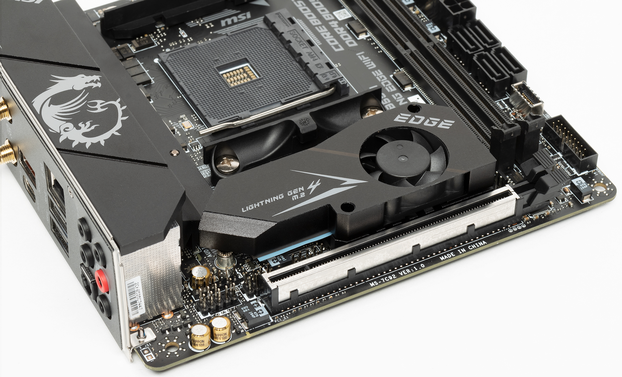 Слот M.2_1 расположен прямо над очень маленьким и плоским радиатором чипсета В550, накопитель в M.2_1 может и сам перегреваться, и дополнительно подогревать В550, поэтому для гарантии охлаждения сверху установлен радиатор с маленьким вентилятором. Детально об этом позже.