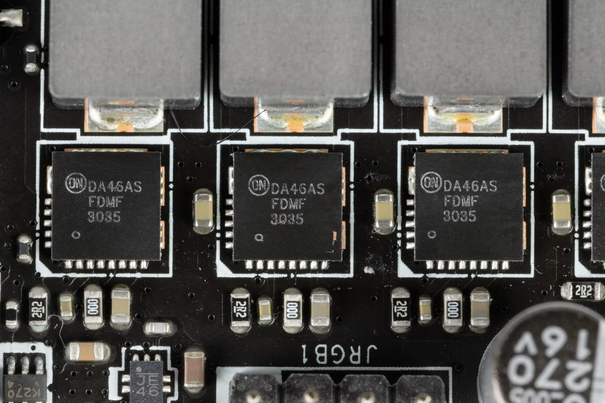 Каждый канал фазы имеет суперферритовый дроссель и FDMF3035 MOSFET от On Semi на 50 А для VCore и встроенного графического ядра.