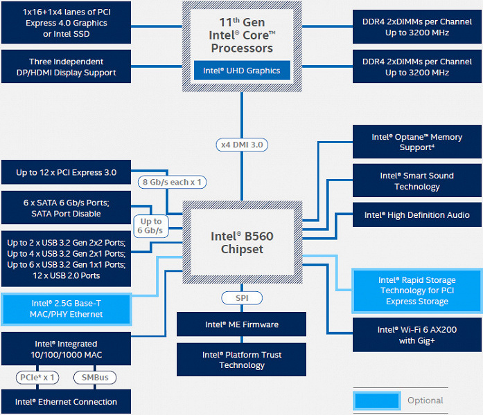 Процессоры Intel Core 11-го поколения (совместимые с сокетом LGA1200 и поддерживаемые B560) имеют 20 линий ввода-вывода PCIe 4.0, не имеют USB и SATA портов. При этом взаимодействие с B560 идет по особому каналу Digital Media Interface 3.0 (DMI 3.0). Все PCIe линии процессора идут на слоты расширения PCIe и порт М.2. Serial Peripheral Interface (SPI) используется для взаимодействия с системой UEFI/BIOS и для связи с устройствами ввода/вывода, не требующими высокой пропускной способности (контроллерами вентиляторов, TPM, старой периферии). Процессоры Intel Core 10-го поколения (совместимые с сокетом LGA1200) имеют 16 линий ввода-вывода PCIe 3.0, которые идут только на слоты расширения PCIe.