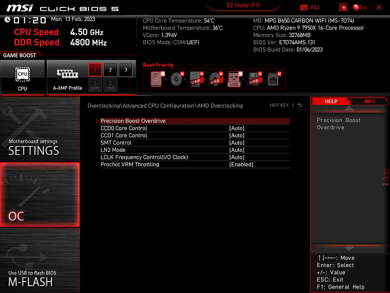 Также MSI MPG B650 Carbon WiFi предлагает неплохой набор настроек в BIOS Setup для любителей разгона.