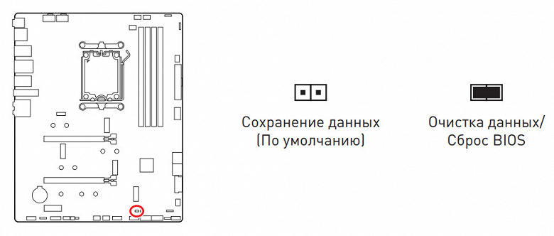 - Переключатель: или слот PCIe x16 (PCI_E1) (16 линий PCIe 4.0) и порты M.2 (M2_2, M2_3) отключены; или порты M.2 (M2_2, M2_3) активны (4 + 4 линии PCIe 4.0), но слот PCIe x16 (PCI_E1) получает 8 линий PCIe 4.0