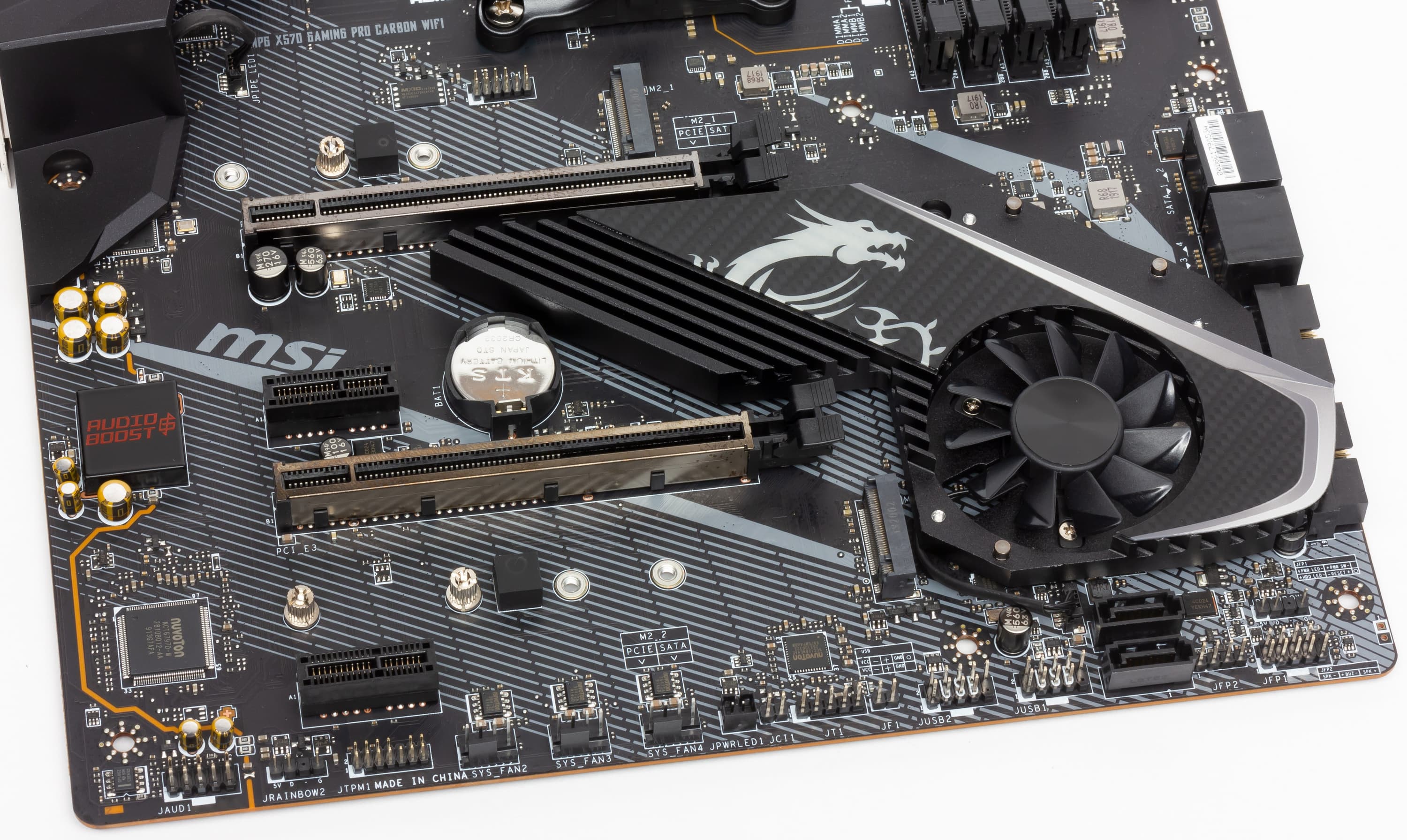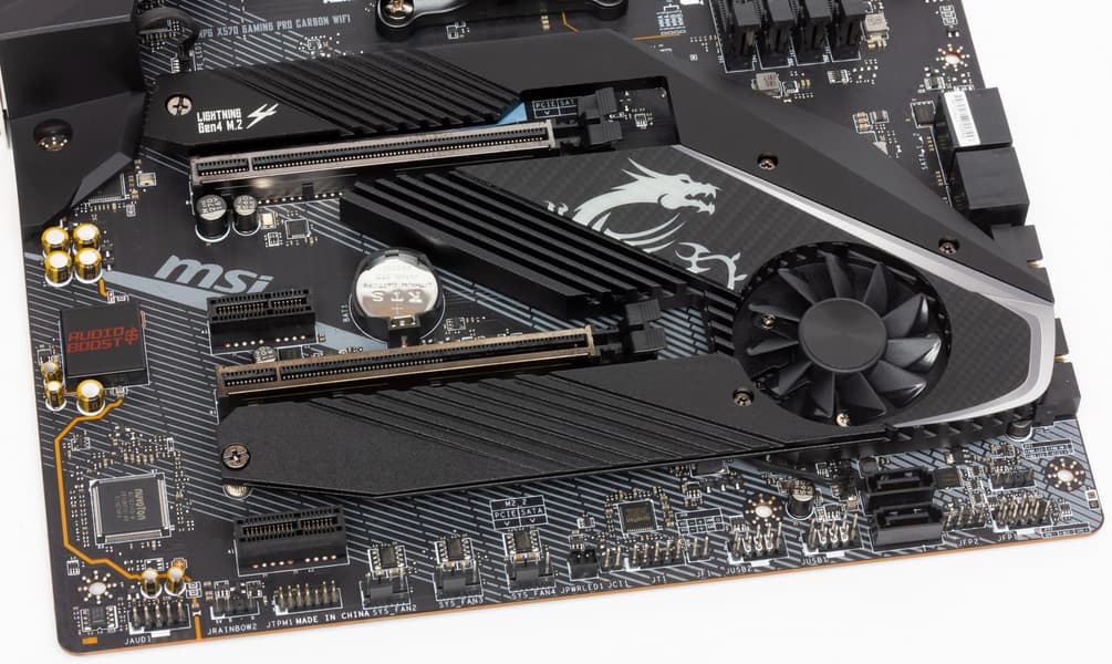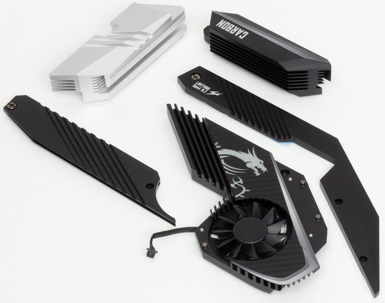 Все потенциально сильно греющиеся элементы имеют свои собственные радиаторы. Как известно, самым горячим звеном в наборе AMD X570 является сам чипсет, поэтому многие производители вынуждены вспомнить про вентиляторы для такого рода микросхем (до того все топовые десктопные продукты (не HEDT) обходились простыми радиаторами).