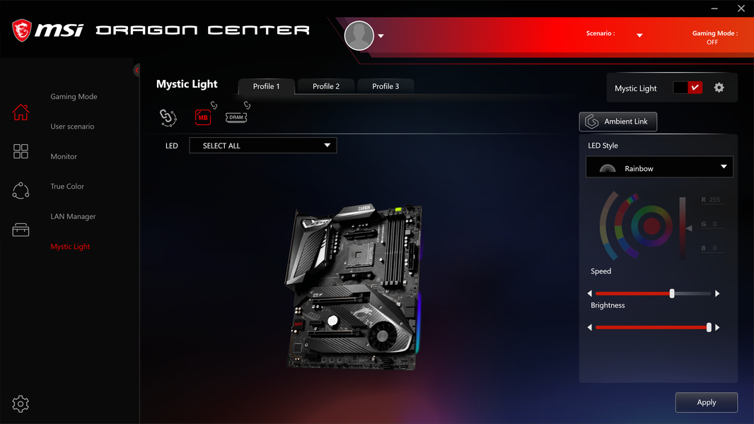 Далее рассмотрим раздел управления подсветкой Mystic Light.
