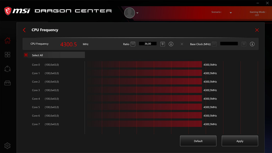 Вот что мы имеем по умолчанию. Понятно, что частоты постоянно меняются: от базовой 3.6 ГГц до примерно 4,37 ГГц (только на некоторых ядрах и то очень кратковременно).
