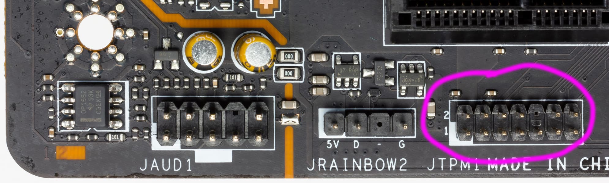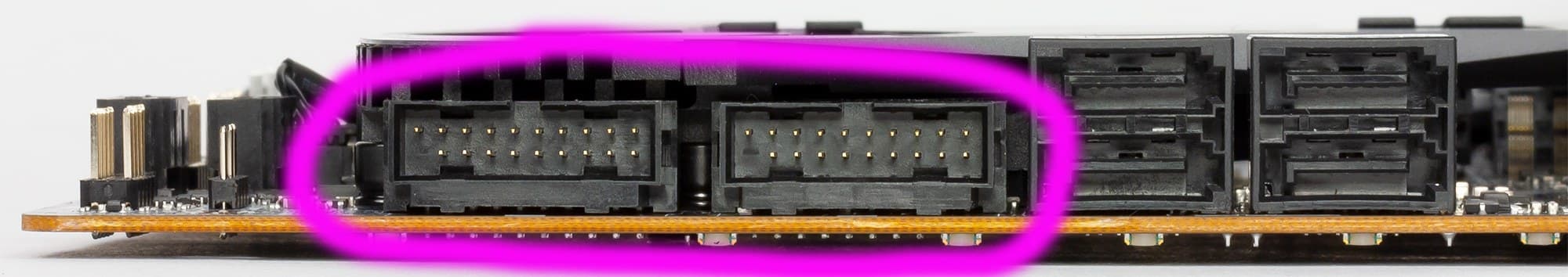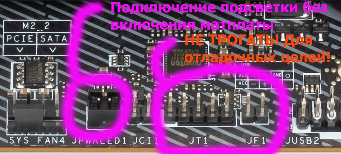 А для демонстрации работы подсветки платы без ее включения (без наличия CPU/RAM) имеется свой разъем. Собственно, это интересно лишь работникам выставочных стендов. Рядом там есть еще блок пинов: это для внутренних отладочно-ремонтных целей.