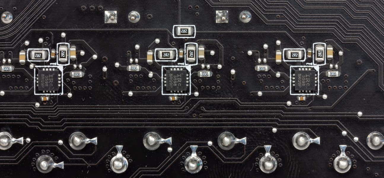 Таким образом ШИМ-контроллер обеспечивает схему 5+2 фаз. Каждый канал «псевдофазы» имеет суперферритовую катушку и транзисторную сборку IR3555 того же Infineon.