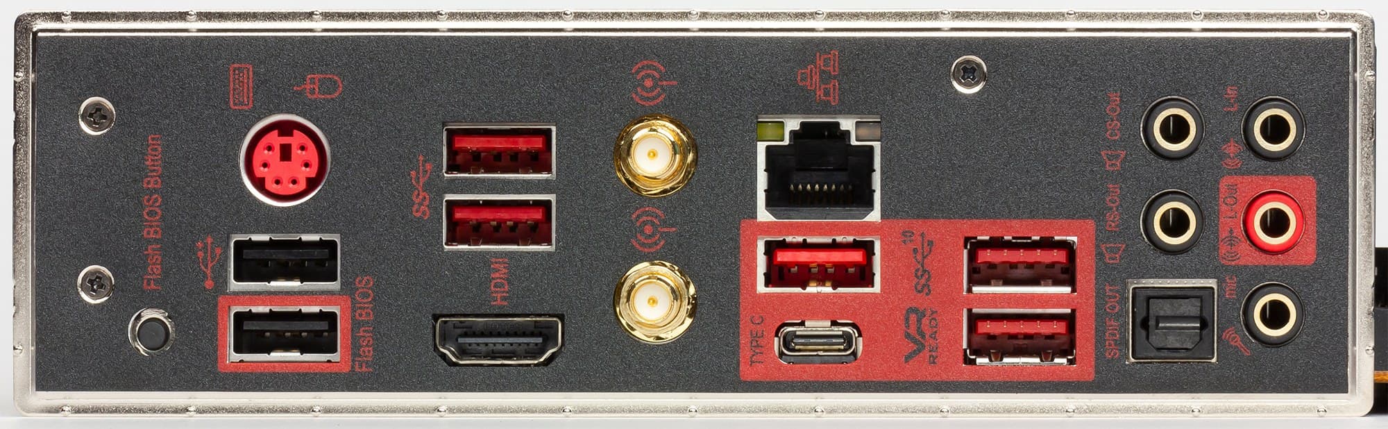 | Разъемы на задней панели | 1 × USB 3.2 Gen2/1 (Type-C) 1 × USB 3.2 Gen2/1 (Type-A) 2 × USB 3.2 Gen2 (Type-A) 2 × USB 3.2 Gen1 (Type-A) 2 × USB 2.0 (Type-A) 1 × RJ-45 1 × HDMI 1.4 5 аудиоразъемов типа миниджек 1 × S/PDIF (оптический, выход) 2 антенных разъема 1 комбинированный разъем PS/2 кнопка перепрошивки BIOS — FlashBIOS |