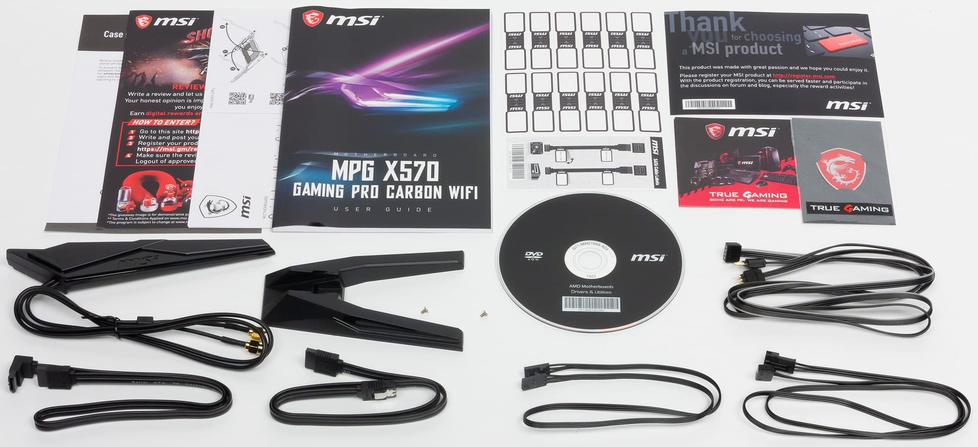 Комплект поставки, кроме традиционных элементов типа руководства пользователя, диска и кабелей SATA (что уже много лет является обязательным набором ко всем материнкам), есть выносная антенна с подставкой для беспроводных соединений, разветвители для подключения подсветки, винтики для монтажа модулей M.2, бонусные стикеры и наклейки. Весь комплект (кроме бумажек) помещен в фирменный тканевый мешок.