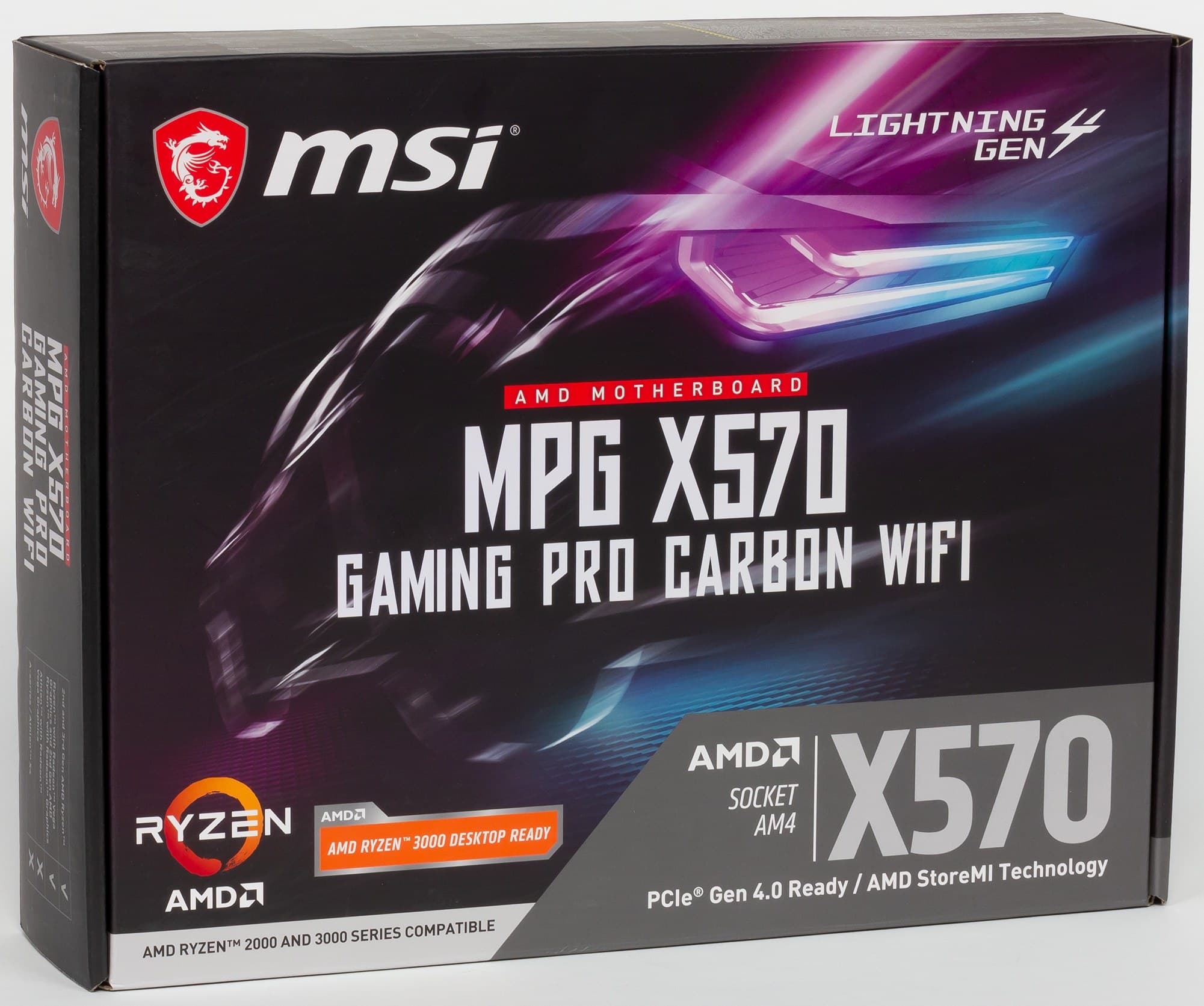 MSI MPG X570 Gaming Pro Carbon WiFi поставляется в большой, но обычной коробке без излишеств. Учитывая любовь MSI к слову Lighting, уже нет удивления, что новую быструю шину PCI-E v.4.0 в части работы с накопителями M.2 (PCI-E интерфейс) в компании назвали по-своему Lighting Gen 4.