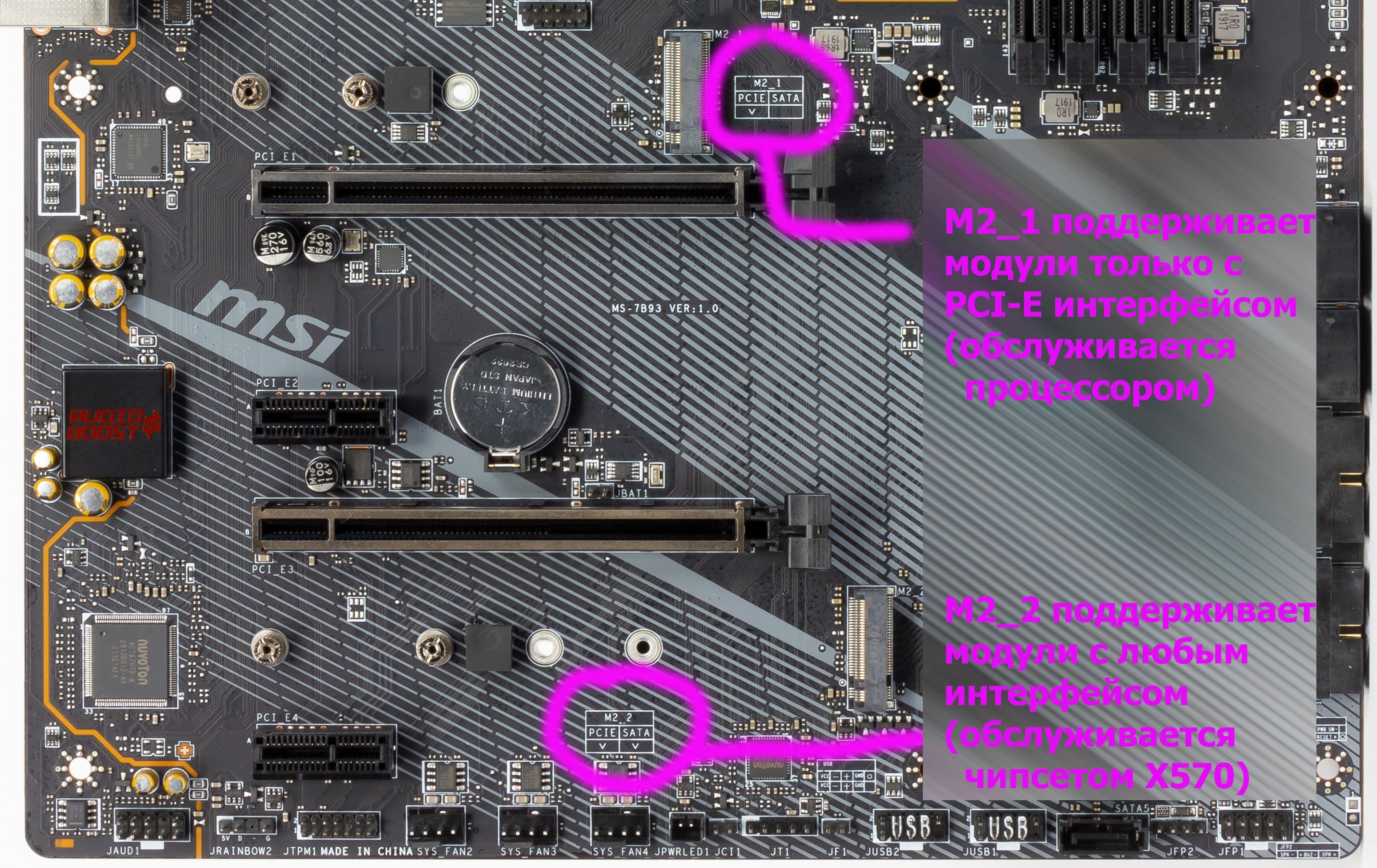 Стоит особо отметить, что верхний слот M.2_1 поддерживает накопители только с интерфейсом PCI-E (в случае использования Ryzen 3000 будет поддержка PCI-E 4.0 — этот слот обслуживается процессором), а нижний M.2_2 поддерживает все виды накопителей (SATA и PCI-E) и обслуживается Х570.
