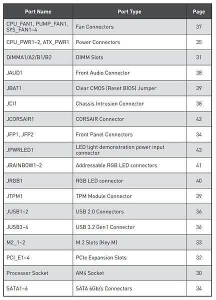 | Прочие внутренние элементы | 24-контактный разъем питания ATX 1 8-контактный разъем питания ATX12V 1 4-контактный разъем питания ATX12V 1 слот M.2 (E-key), занят адаптером беспроводных сетей 2 разъема для подключения 4 портов USB 3.2 Gen1 2 разъема для подключения 4 портов USB 2.0 6 разъемов для подключения 4-контактных вентиляторов (поддержка помп ЖСО) 1 разъем для подключения неадресуемой RGB-ленты 2 разъема для подключения адресуемой ARGB-ленты 1 разъем для подключения RGB-подсветки от Corsair 1 разъем аудио для передней панели корпуса 1 разъем TPM 2 разъема для подключения управления с передней панели корпуса 1 перемычка сброса CMOS 1 разъем сигнала открытого корпуса системного блока |