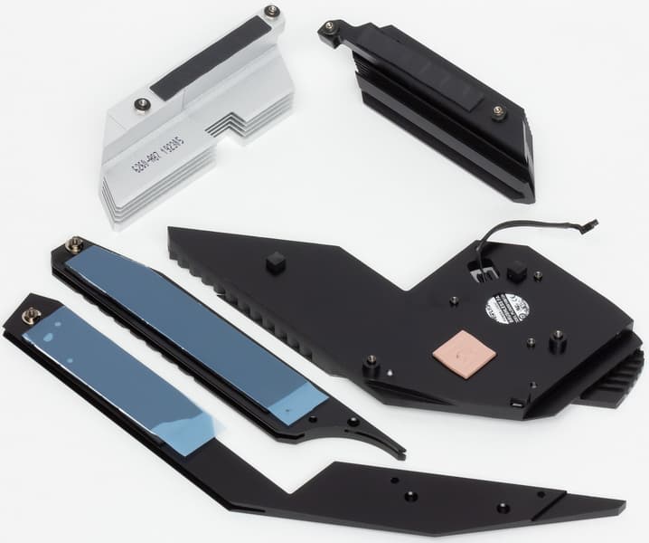 Как мы видим, охлаждение чипсета (один радиатор) и силовых преобразователей (два радиатора под прямым углом друг ко другу) не связано в единую схему, поскольку все три радиатора (два на VRM и один на Х570) никак не соединяются, а вот радиаторы для модулей M.2 привинчиваются к чипсетному радиатору, поэтому если включится вентилятор на радиаторе чипсета, то он же охладит и модули M.2.