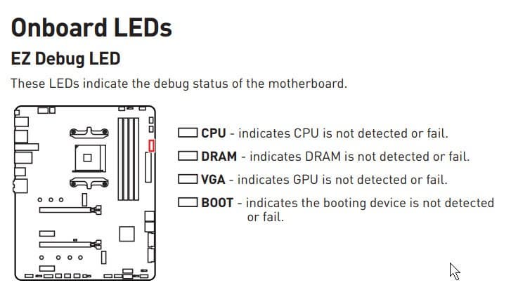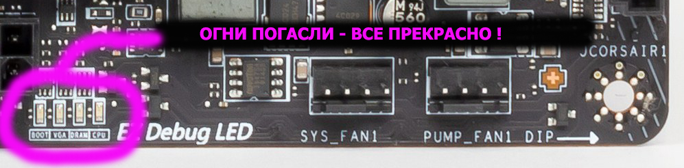 У материнской платы имеются световые индикаторы, сообщающие о проблемах с тем или иным компонентом системы. Если после включения компьютера к моменту перехода на загрузку ОС все индикаторы погасли, то проблем нет.