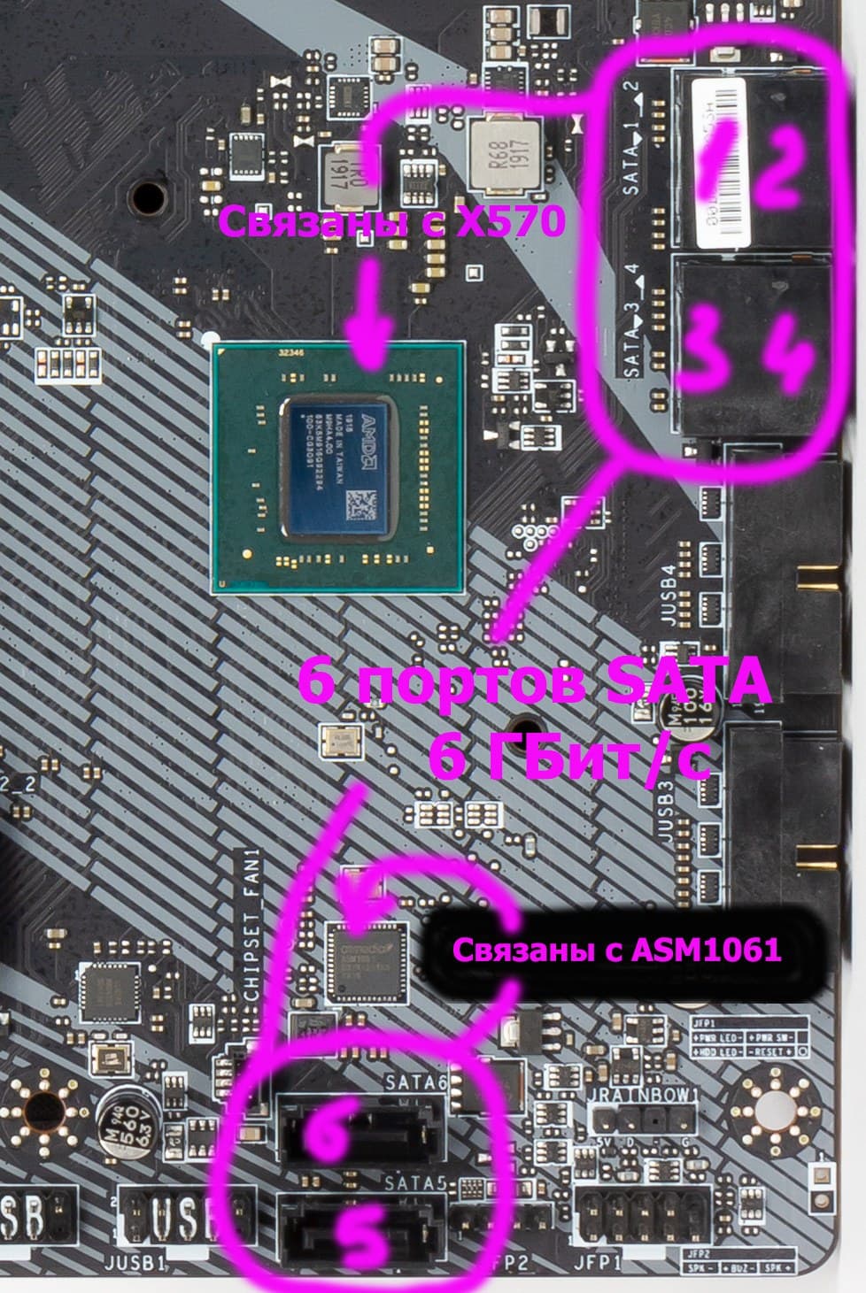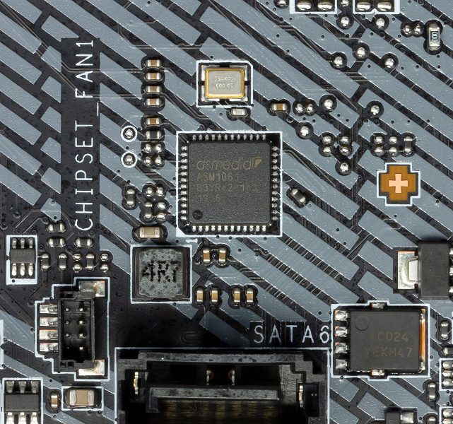 4 порта SATA600 реализованы через чипсет X570, а еще два — через дополнительный контроллер ASM1061 от ASMedia.