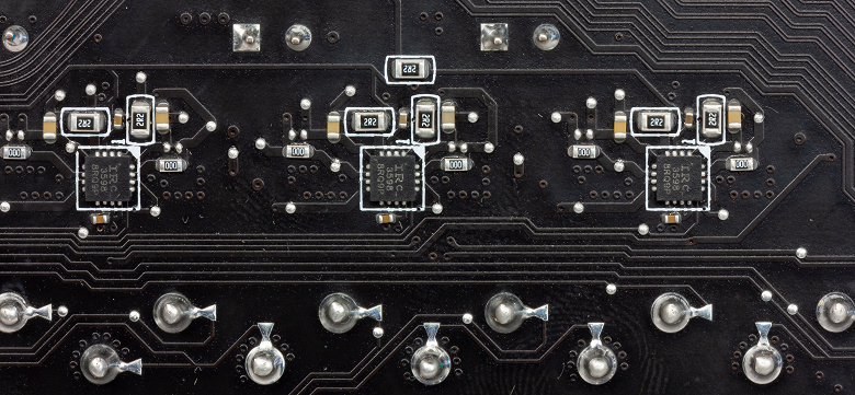 На оборотной стороне мало элементов, там размещены удвоители фаз питания и иная мелкая логика. Обработан текстолит хорошо: во всех точках пайки острые концы срезаны. Серые «капли» на текстолите означают, что на несущей плате корпуса в этом месте могут быть втулки крепления, то есть перед монтажом материнки следует убедиться, что втулки из этих мест удалены.