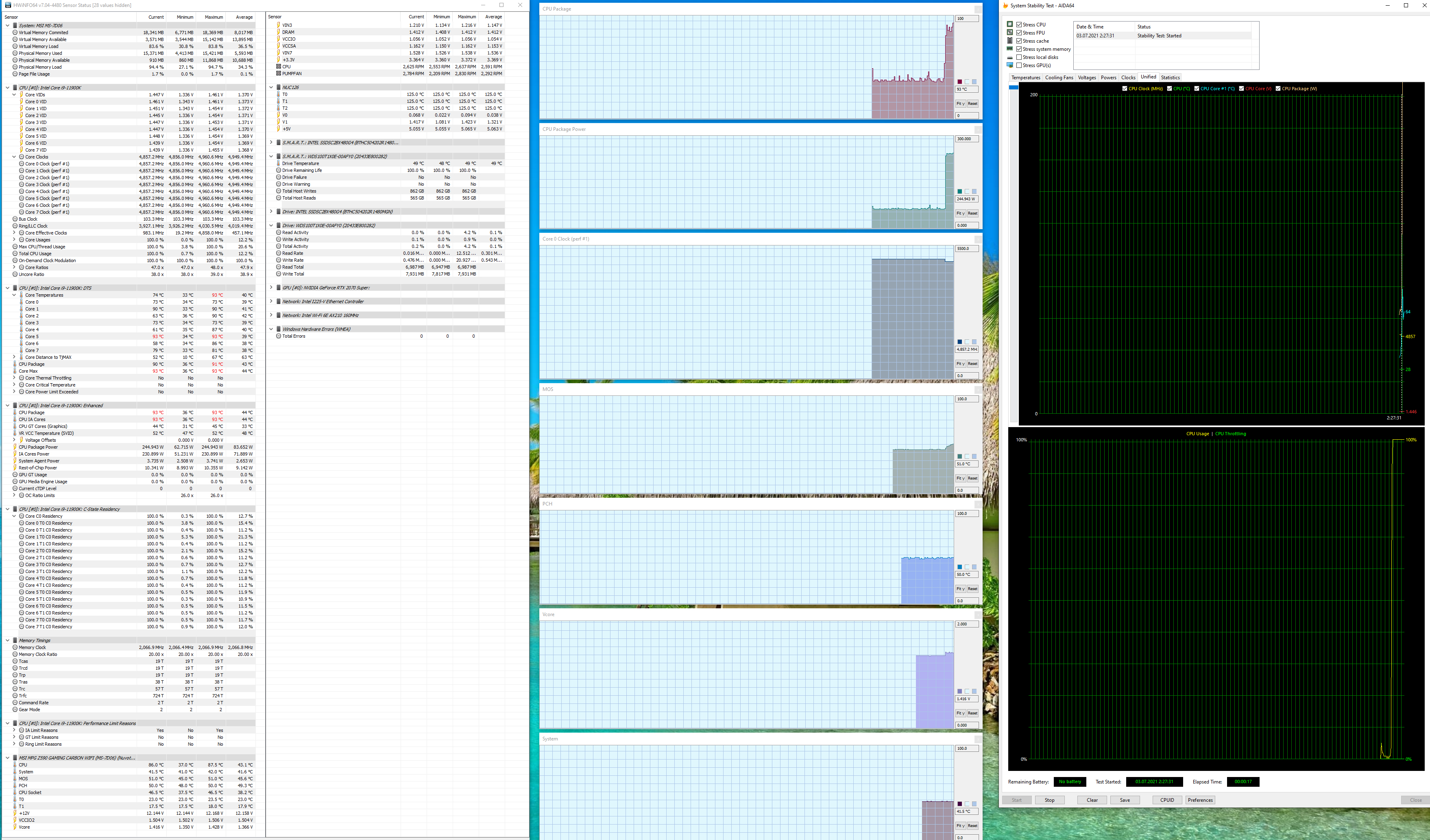 Изначально выставленные частоты порадовали, ибо получить 4,9 ГГц по всем ядрам — это очень хороший результат для такой «печки» как 11900К. Однако что мы видим? - Автооверклокинг снова выставил чрезмерно высокий вольтаж на ядре CPU, и через какое-то время чрезмерных нагрузок пошел троттлинг от перегрева.