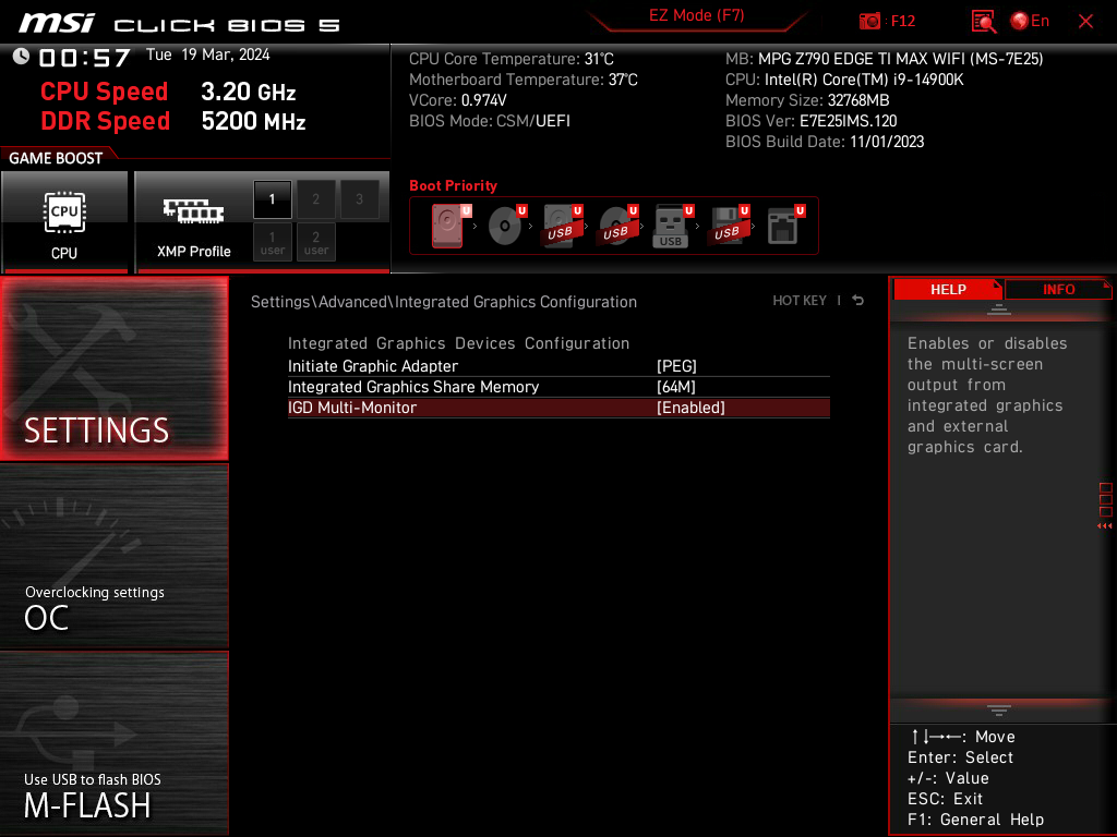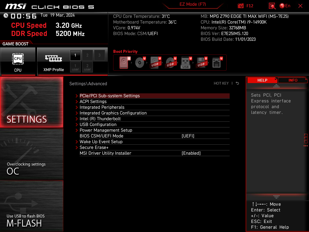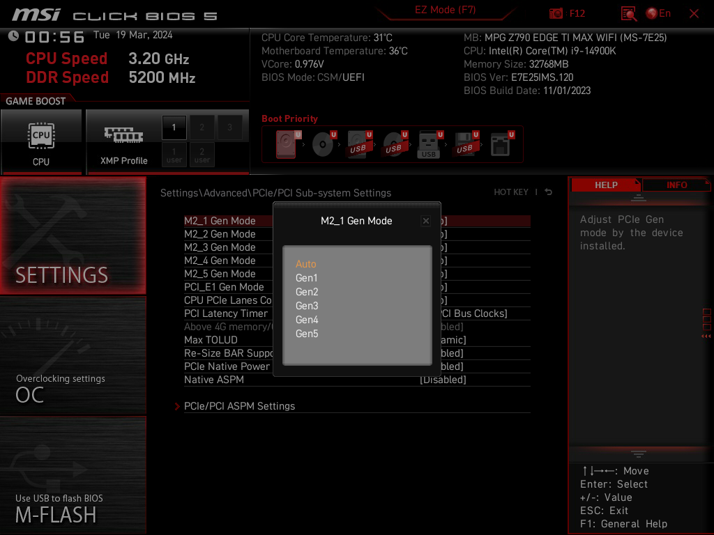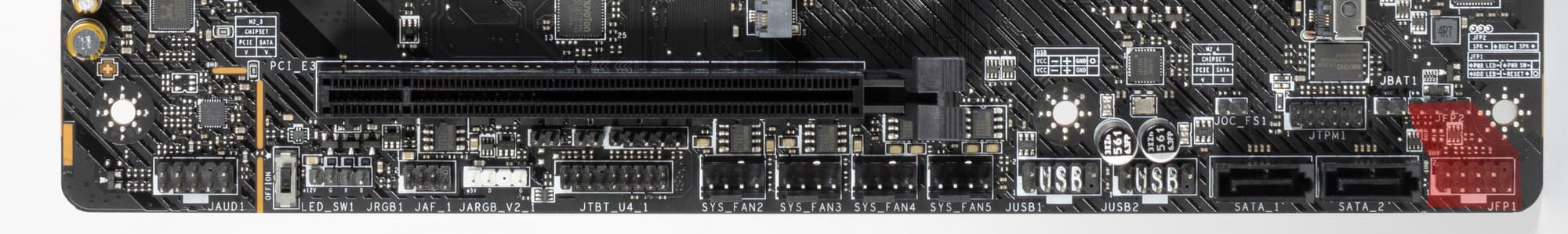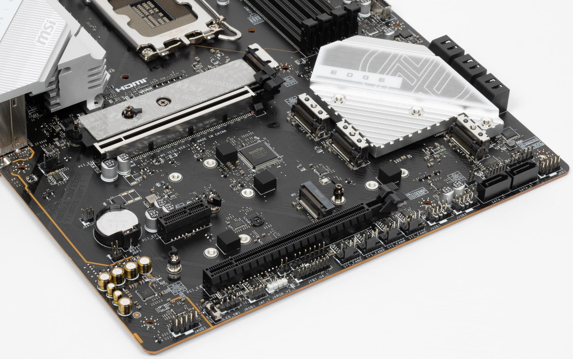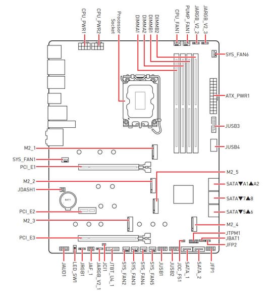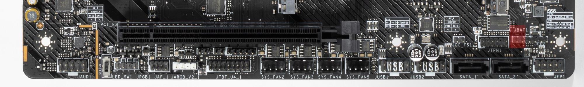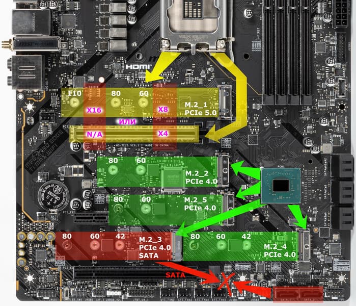 Второй, третий, четвертый и пятый слоты M.2 получают данные от чипсета Z790, при этом все они поддерживают PCIe 4.0. Про первый M.2_1 я уже выше писал: он получает данные от CPU (PCIe 5.0) и делит линии со первым слотом PCI_E1. При этом М.2_3 поддерживает модули с любым интерфейсом, а все остальные работают с модулями только с PCIe интерфейсом.
