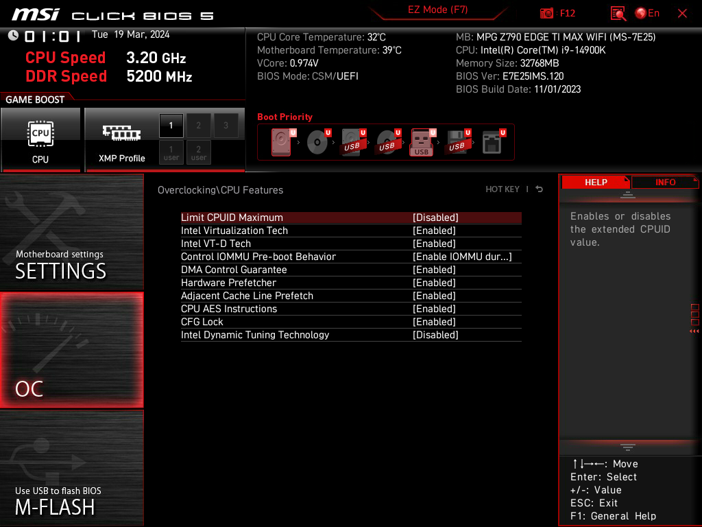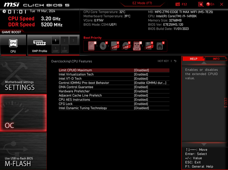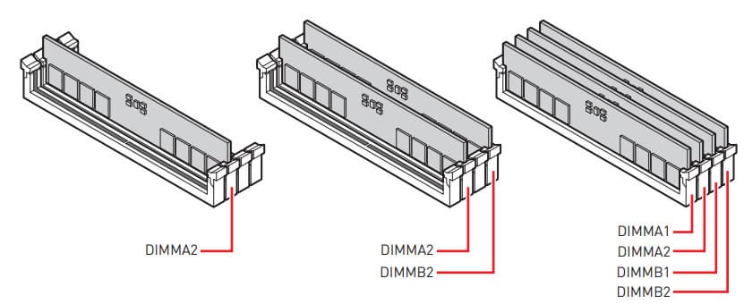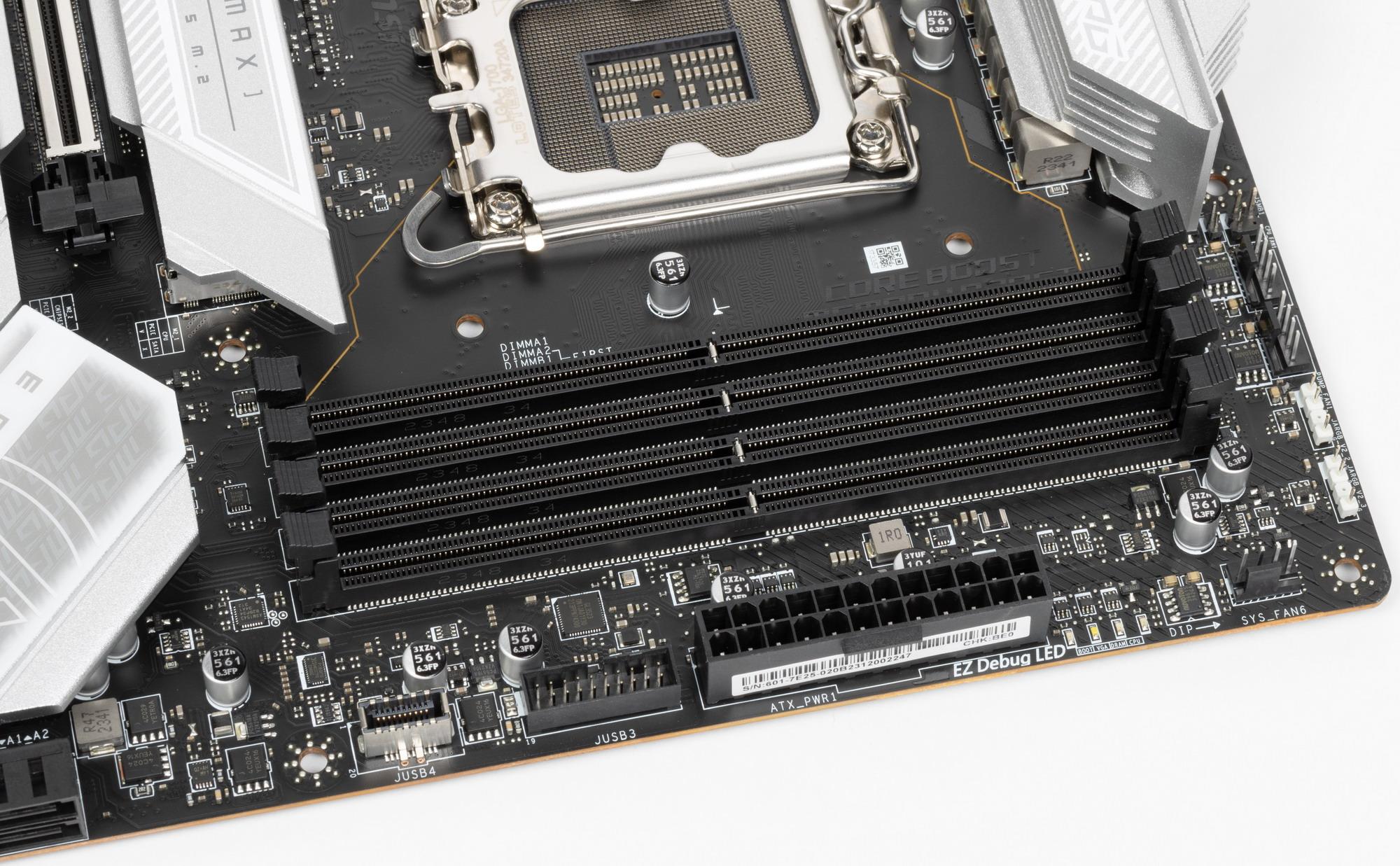 Для установки модулей памяти на плате MSI имеется четыре DIMM-слота (для работы памяти в Dual Channel в случае использования всего 2 модулей их следует устанавливать в А2 и B2. Плата поддерживает небуферизованную память DDR5 (non-EСС), а максимальный объем памяти составляет 192 ГБ. Поддерживаются профили XMP.