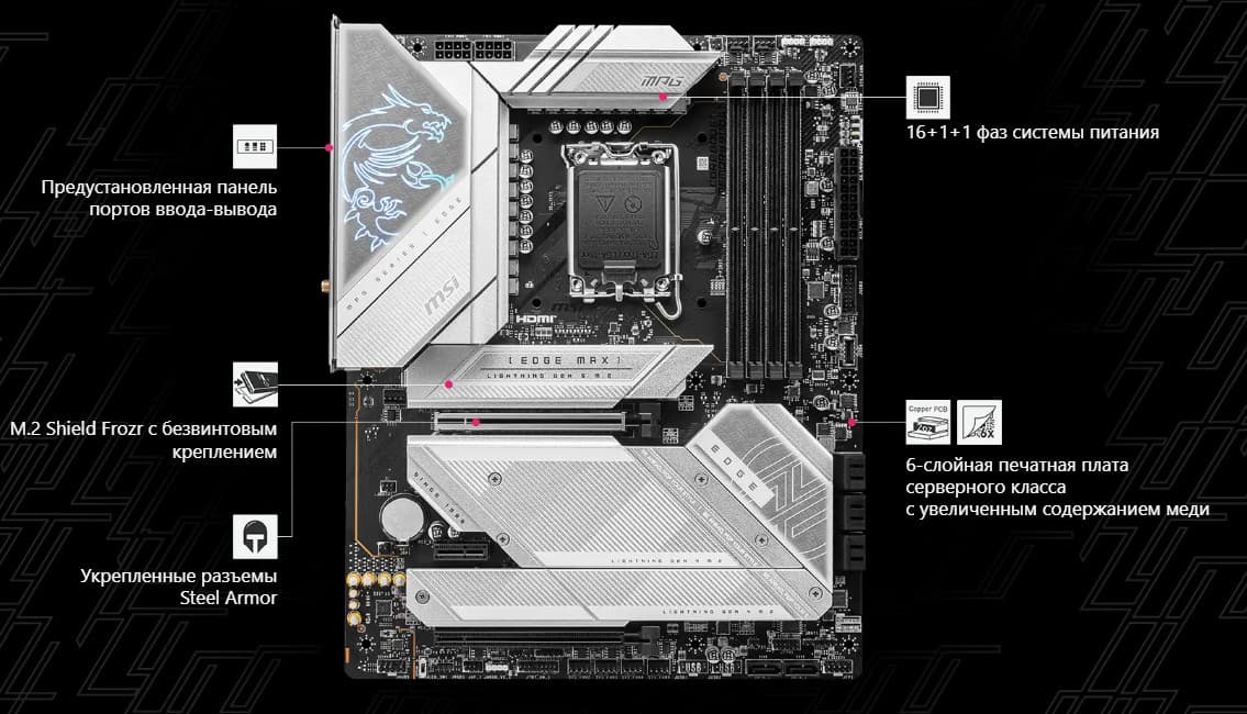 Материнская плата MSI MPG Z790 Edge Ti Max WiFi — представитель почти флагманской серии MPG с примерной стоимостью в районе 50 тысяч рублей.