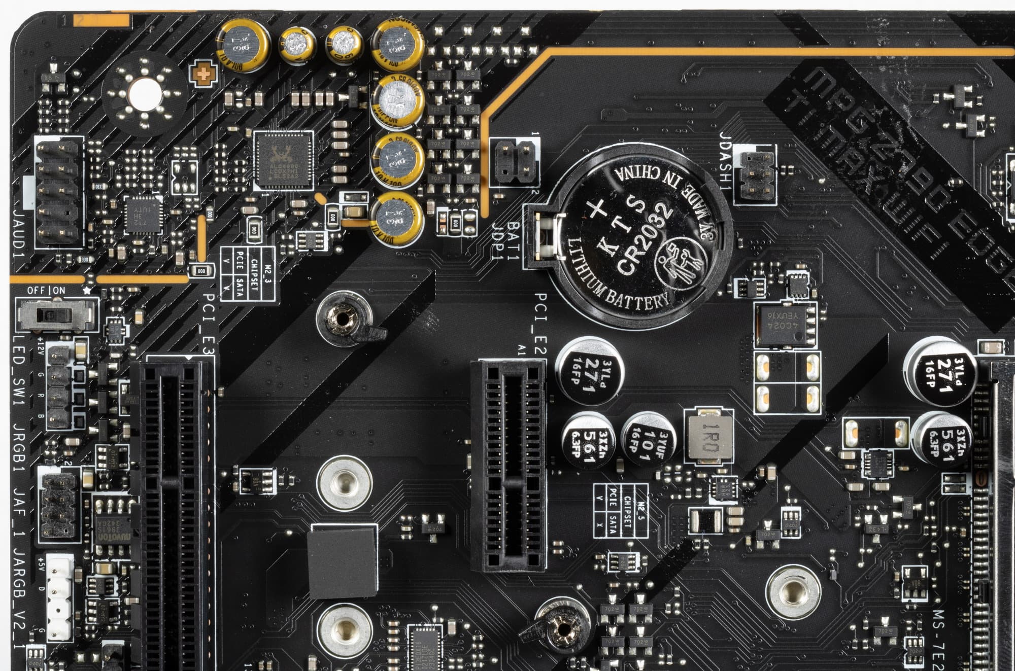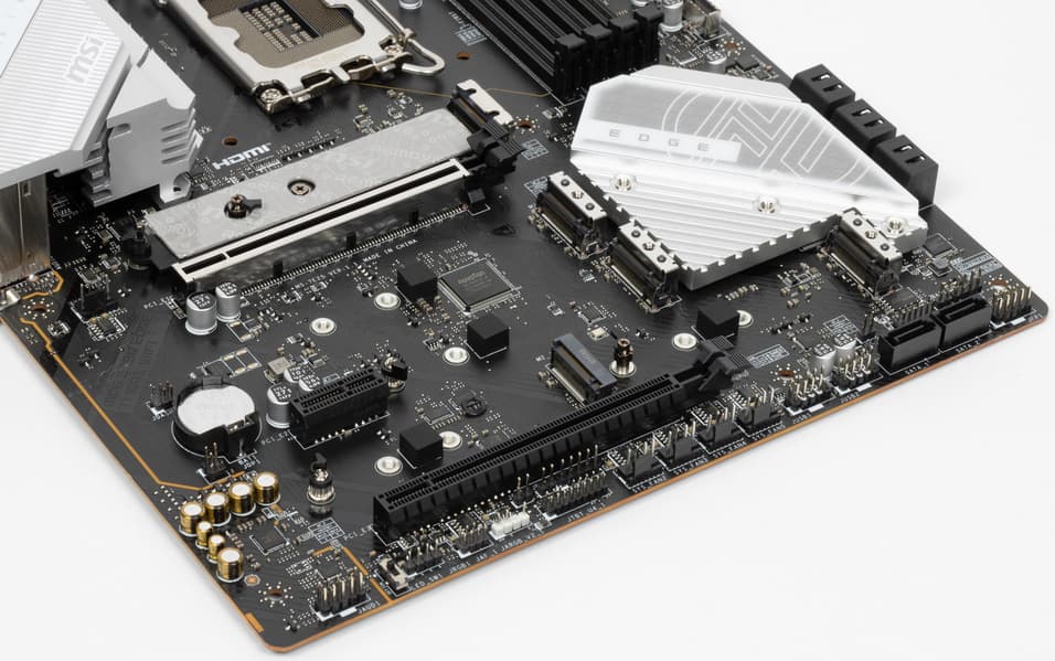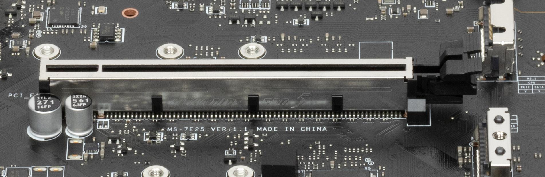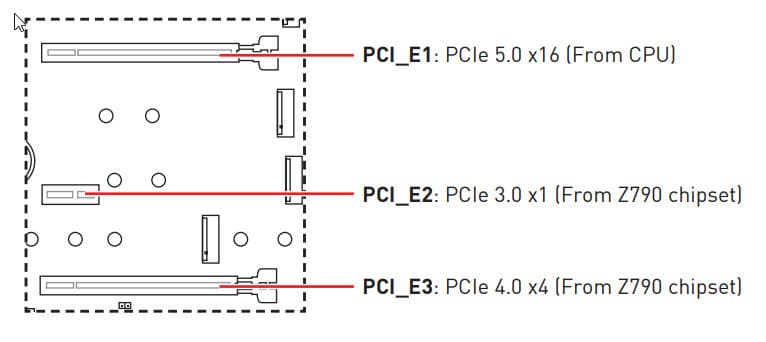 Всего на плате есть 3 слота: слот PCIe x16_1 (PCI_E1) (для видеокарт или других устройств), слот PCIe x16_2 (PCI_E3, фактически имеющий 4 линии) и один PCIe_x1 (PCI_E2). Если про первый PCIe x16 я выше уже рассказал (он подключен к CPU), то PCIe x16_2 подключен к Z790 и работает в режиме х4.