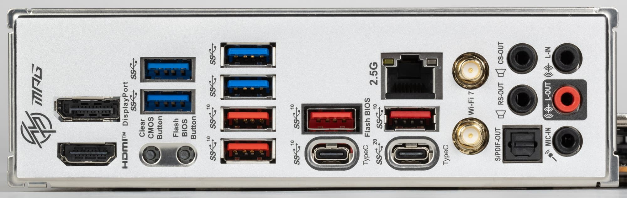 | Разъемы на задней панели | 1 × USB 3.2 Gen2x2 (Type-C) 1 × USB 3.2 Gen2 (Type-C) 4 × USB 3.2 Gen2 (Type-A) 4 × USB 3.2 Gen1 (Type-A) 1 × RJ-45 5 аудиоразъемов типа миниджек 1 разъем S/PDIF 2 антенных разъема 1 разъем HDMI out 1 разъем Display Port out кнопка сброса CMOS кнопка перепрошивки BIOS — Flash BIOS |