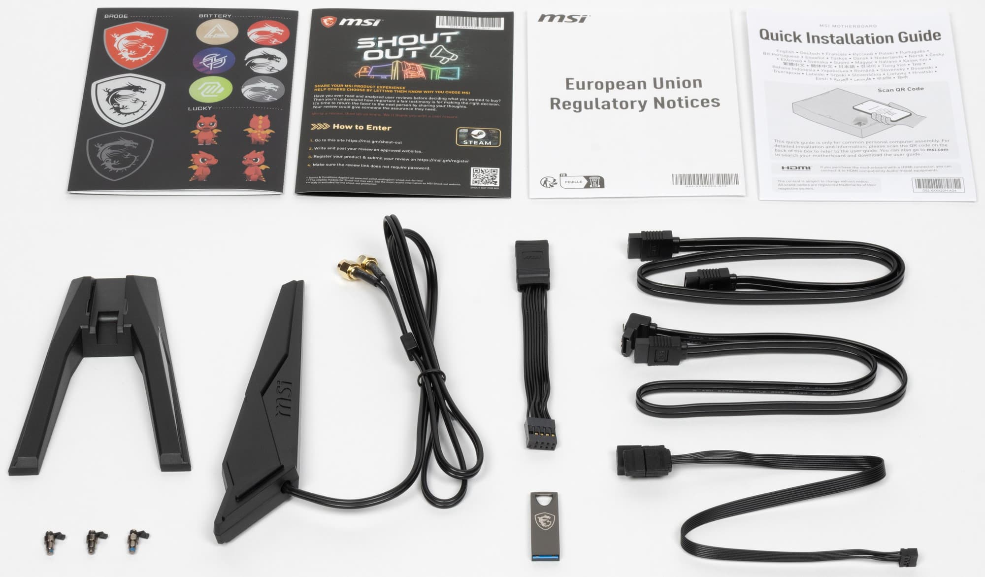 Комплект поставки весьма прост: кроме традиционных элементов типа руководства пользователя и кабелей SATA, имеются USB-накопитель с ПО, антенны встроенного Wi-Fi-модуля, дополнительные крепежи для М.2 слотов, адаптер для удобного подключения разъемов с передней панели корпуса, универсальный разветвитель подсветки, бонусные стикеры.