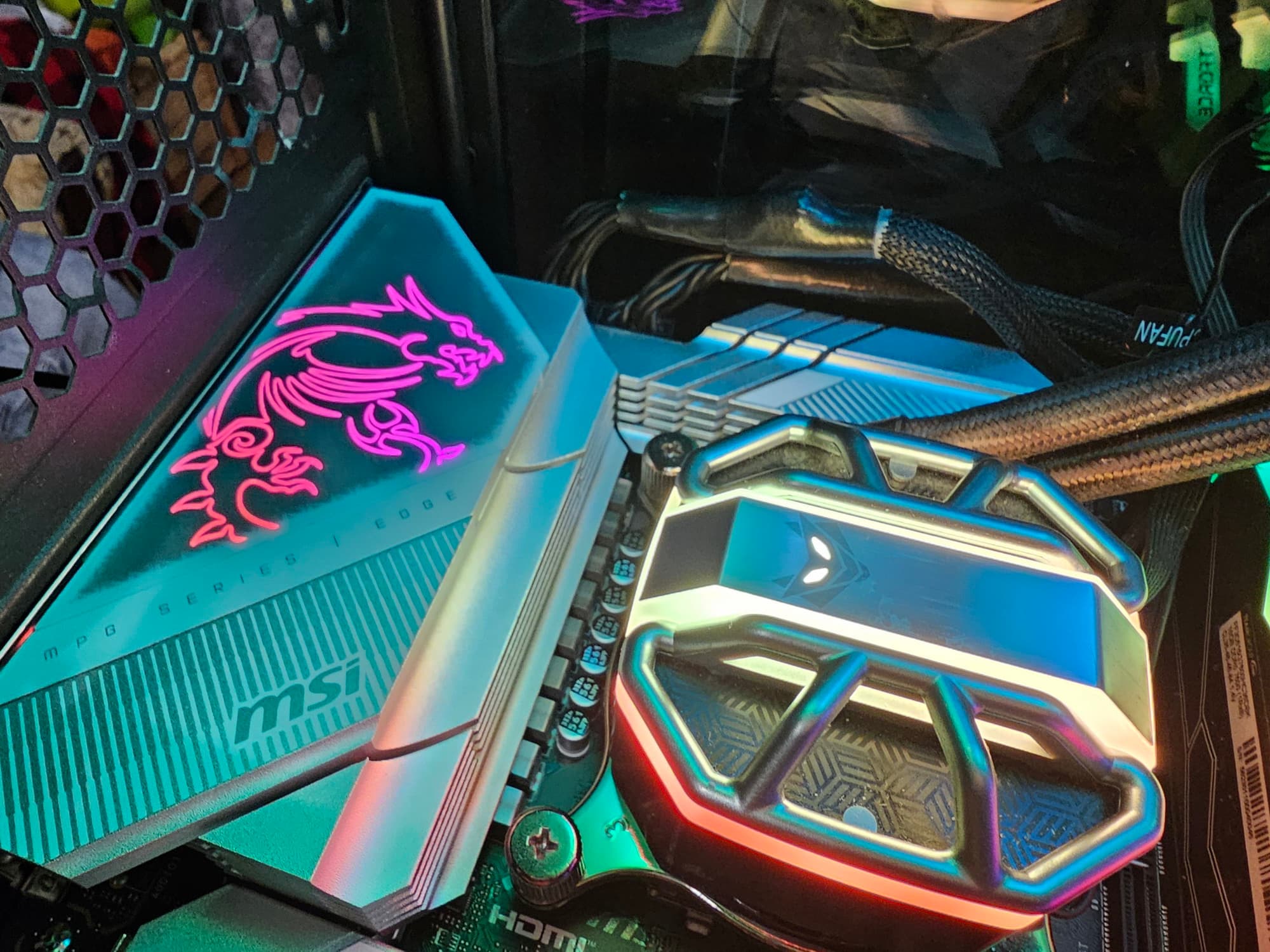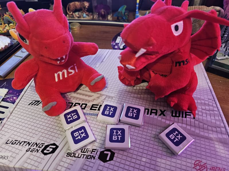Еще у этой модели 8 портов SATA и 8 разъемов для вентиляторов. Плата относится к серии MPG, одной из флагманских, так что система питания процессора у нее очень мощная, она способна обеспечить работу любых совместимых процессоров с приличным запасом на разгон (хотя в схеме используются удвоители фаз питания). Также мы видим очень грамотную систему охлаждения каждого потенциально греющегося элемента, включая накопители в слотах M.2. Сетевые возможности хорошие: быстрый проводной контроллер 2,5 Гбит/с, а также самый современный беспроводной с поддержкой Wi-Fi 7 и Bluetooth 5.4. В числе плюсов платы можно упомянуть широкие возможности для подключения RGB-устройств подсветки, а также дизайн с приятной подсветкой.