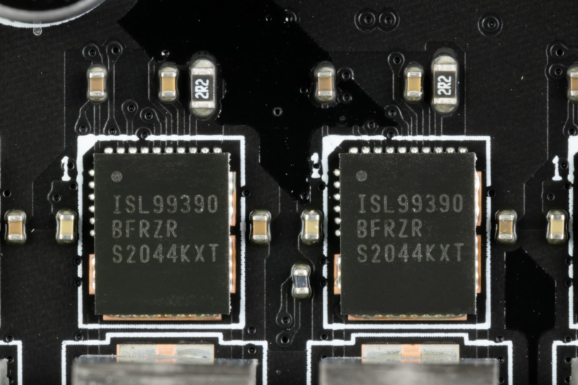 Так что мы видим, что схема питания должна иметь или удвоители, или просто параллельные потоки. Заглянув на оборотную сторону матплаты, находим там удвоители фаз ISL6617A от Renesas, как раз 8 штук. Так что, схема реально выглядит как 8х2+1+1 – всего 10 реальных фаз питания, девятью из них и управляет вышеназванный ШИМ-контроллер.